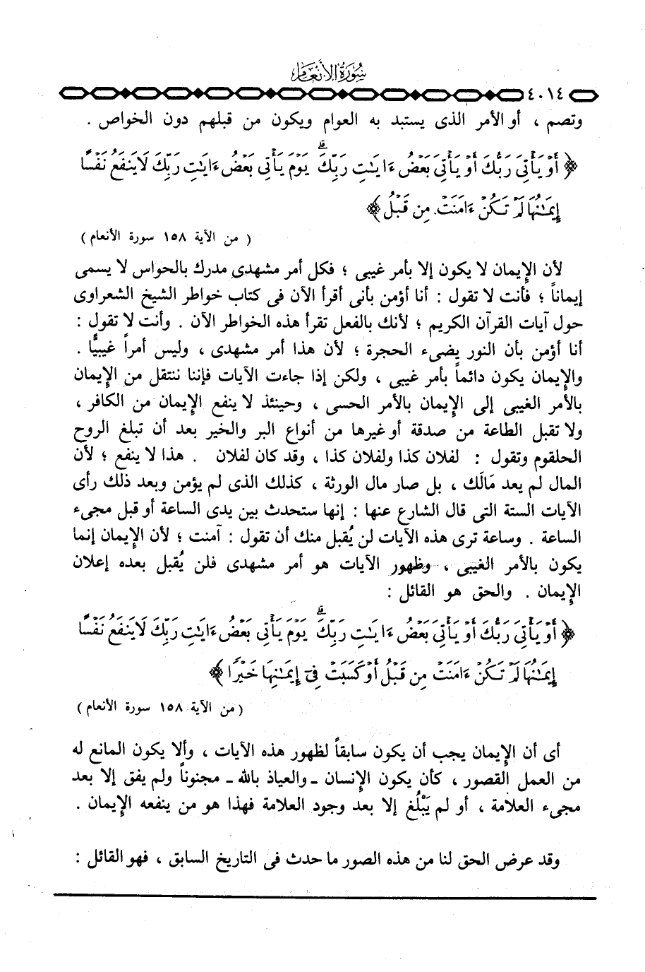 {أَوْ يَأْتِيَ رَبُّكَ أَوْ يَأْتِيَ بَعْضُ آيَاتِ رَبِّكَ يَوْمَ يَأْتِي بَعْضُ آيَاتِ رَبِّكَ لاَ يَنفَعُ نَفْساً إِيمَانُهَا لَمْ تَكُنْ آمَنَتْ مِن قَبْلُ} [الأنعام: 158]