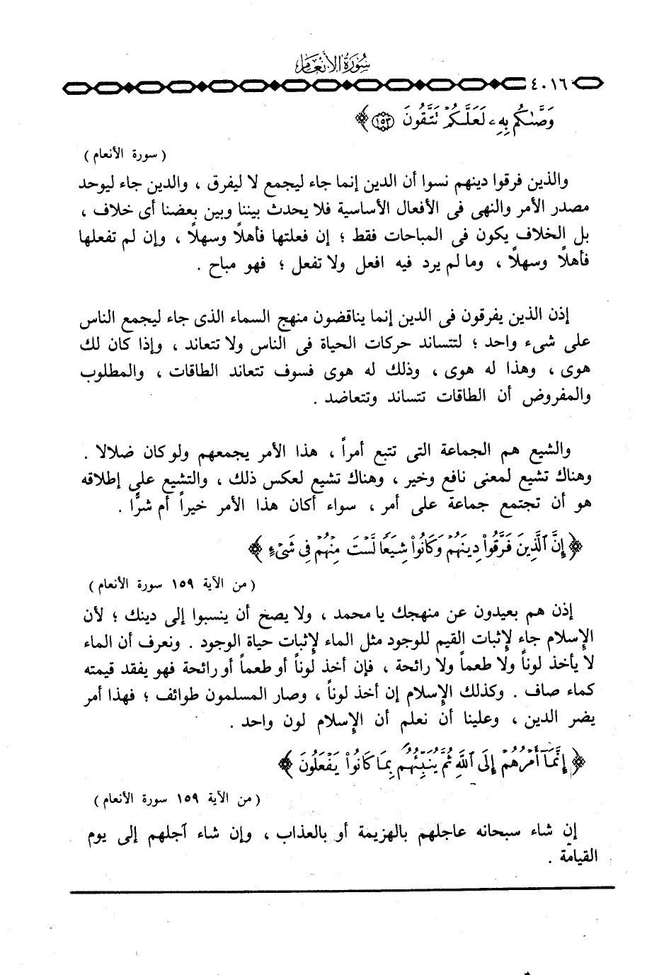 إذن هم بعيدون عن منهجك يا محمد، ولا يصح أن ينسبوا إلى دينك؛ لأن الإسلام جاء لإثبات القيم للوجود مثل الماء لإثبات حياة الوجود. ونعرف أن الماء لا يأخذ لوناً ولا طعماً ولا رائحة، فإن أخذ لوناً أو طعماً أو رائحة فهو يفقد قيمته كماء صاف. وكذلك الإسلام إن أخذ لوناً، وصار المسلمون طوائف؛ فهذا أمر يضر الدين، وعلينا أن نعلم أن الإسلام لون واحد. { ... إِنَّمَآ أَمْرُهُمْ إِلَى الله ثُمَّ يُنَبِّئُهُم بِمَا كَانُواْ يَفْعَلُونَ} [الأنعام: 159]