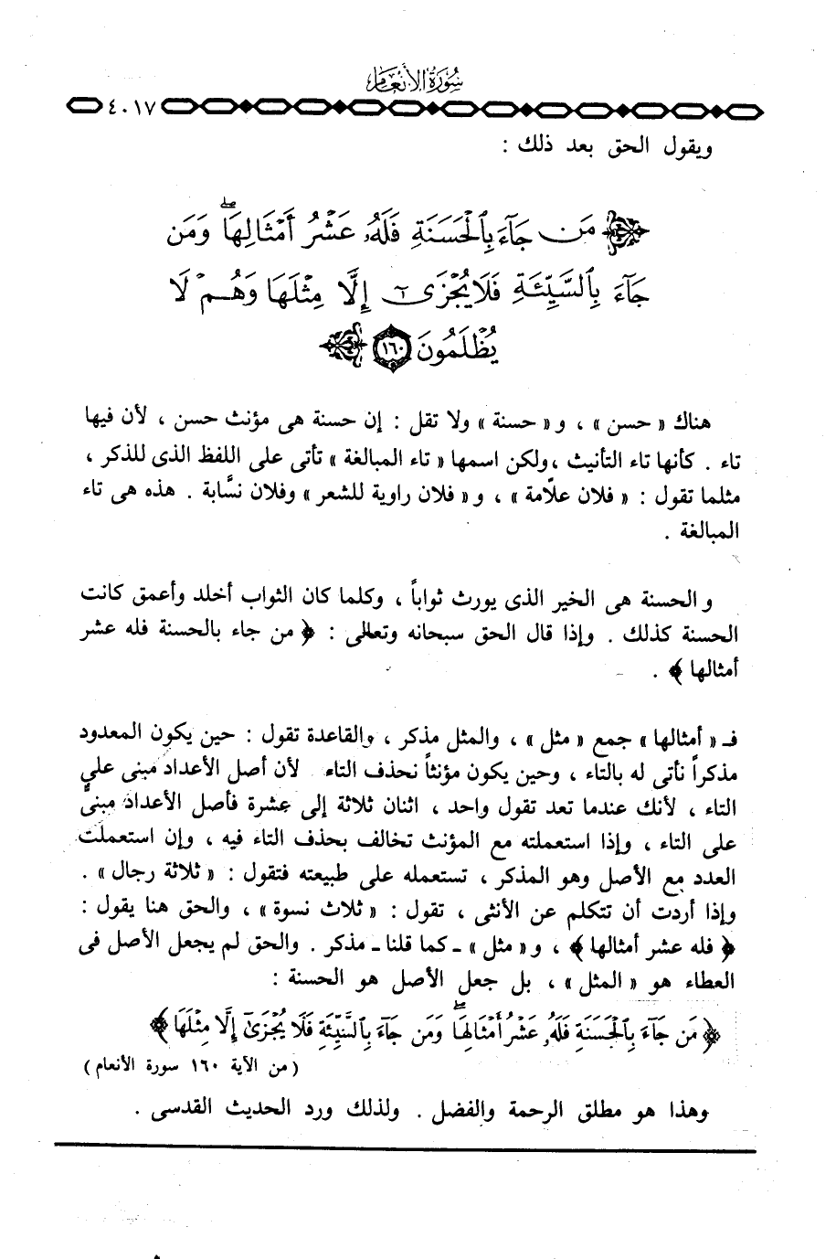 ف «أمثالها» جمع «مثل» ، والمثل مذكر، والقاعدة تقول: حين يكون المعدود مذكراً نأتي له بالتاء، وحين يكون مؤنثاً نحذف التاء لأن أصل الأعداد مبني على التاء، لأنك عندما تعد تقول واحد، اثنان ثلاثة إلى عشرة فأصل الأعداد مبنيٌّ على التاء، وإذا استعملته مع المؤنث تخالف بحذف التاء فيه، وإن استعملت العدد مع الأصل وهو المذكر، تستعمله على طبيعته فتقول: «ثلاثة رجال» . وإذا أردت أن تتكلم عن الأنثى، تقول: «ثلاثة نسوة» ، والحق هنا يقول: {فَلَهُ عَشْرُ أَمْثَالِهَا} ، و «مثل» - كما قلنا - مذكر. والحق لم يجعل الأصل في العطاء هو «المثل» ، بل جعل الأصل هو الحسنة: {مَن جَآءَ بالحسنة فَلَهُ عَشْرُ أَمْثَالِهَا وَمَن جَآءَ بالسيئة فَلاَ يجزى إِلاَّ مِثْلَهَا ... } [الأنعام: 160]
