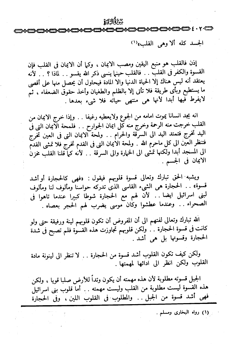 إنه يجد إنساناً يموت أمامه من الجوع ولا يعطيه رغيفا. . وإذا خرج الإيمان من القلب خرجت منه الرحمة وخرج منه كل إيمان الجوارح. . فلمحة الإيمان التي في اليد تخرج فتمتد اليد إلى السرقة والحرام. . ولمحة الإيمان التي في العين تخرج فتنظر العين إلى كل ما حرم الله. ولمحة الإيمان التي في القدم تخرج فلا تمشي القدم إلى المسجد أبدا ولكنها تمشي إلى الخمارة وإلى السرقة. . لأنه كما قلنا القلب مخزن الإيمان في الجسم.