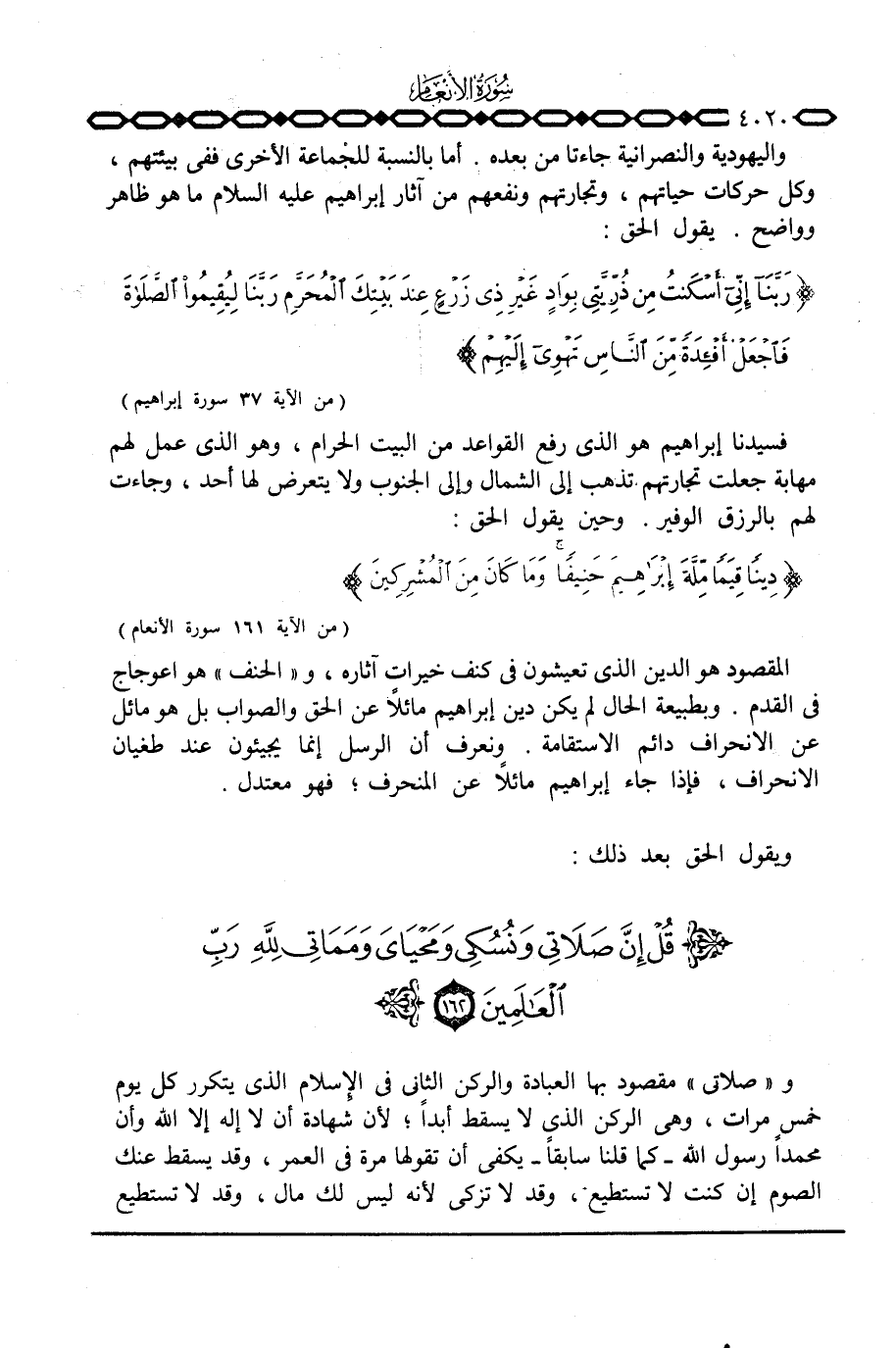 المقصود هو الدين الذي تعيشون في كنف خيرات آثاره، و «الحنف» هو اعوجاج في القدم. وبطبيعة الحال لم يكن دين إبراهيم مائلاً عن الحق والصواب بل هو مائل عن الانحراف دائم الاستقامة. ونعرف أن الرسل إنما يجيئون عند طغيان الانحراف، فإذا جاء إبراهيم مائلاً عن المنحرف؛ فهو معتدل.