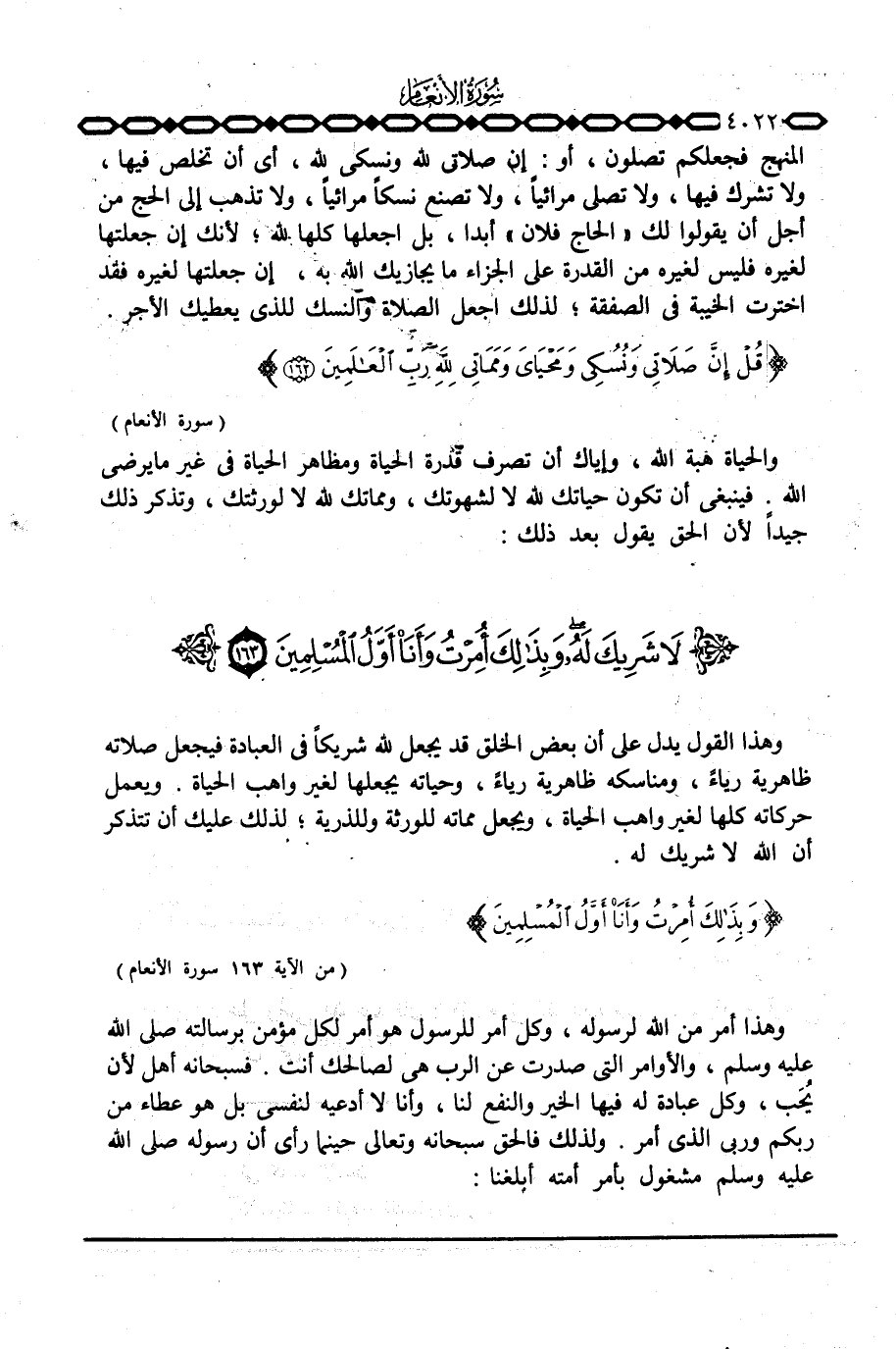 المنهج فجعلكم تصلون، أو: إن صلاتي لله ونسكي لله، أي أن تخلص فيها، ولا تشرك فيها، ولا تصلي مرائياً، ولا تصنع نسكاً مرائياً، ولا تذهب إلى الحج من أجل أن يقولوا لك: «الحاج فلان» أبداً، بل اجعلها كلها لله؛ لأنك إن جعلتها لغيره فليس لغيره من القدرة على الجزاء ما يجازيك الله به؛ إن جعلتها لغيره فقد اخترت الخيبة في الصفقة؛ لذلك اجعل الصلاة والنسك للذي يعطيك الأجر. {قُلْ إِنَّ صَلاَتِي وَنُسُكِي وَمَحْيَايَ وَمَمَاتِي للَّهِ رَبِّ العالمين} [الأنعام: 162]
