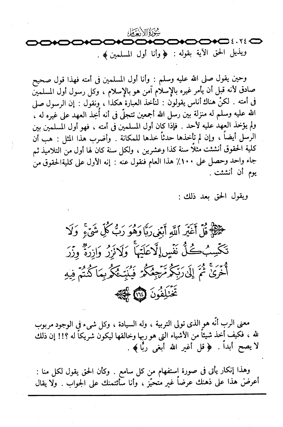 وحين يقول صَلَّى اللَّهُ عَلَيْهِ وَسَلَّم َ: وأنا أول المسلمين في أمته فهذا قول صحيح صادق لأنه قبل أن يأمر غيره بالإسلام آمن هو بالإسلام، وكل رسول أول المسلمين في أمته، لكن هناك أناس يقولون: لنأخذ العبارة هكذا، ونقول: إن الرسول صَلَّى اللَّهُ عَلَيْهِ وَسَلَّم َ له منزلة بين رسل الله أجمعين تتجلى في أنه أخذ العهد على غيره له، ولم يؤخذ العهد علية لأحد. فإن أول المسلمين في أمته، فهو أول المسلمين بين الرسل أيضآ، وإن لم تأخذها حدثاً خذها للمكانة. وأضرب هذا المثل: هب أن كلية الحقوق أنشئت مثلا سنة كذا وعشرين، لكل سنة لها أول من التلاميذ ثم جاء واحد وحصل على 100 ... هذا العام فنقول عنة: إنة الأول على كلية الحقوق من يوم أن أنشئت.