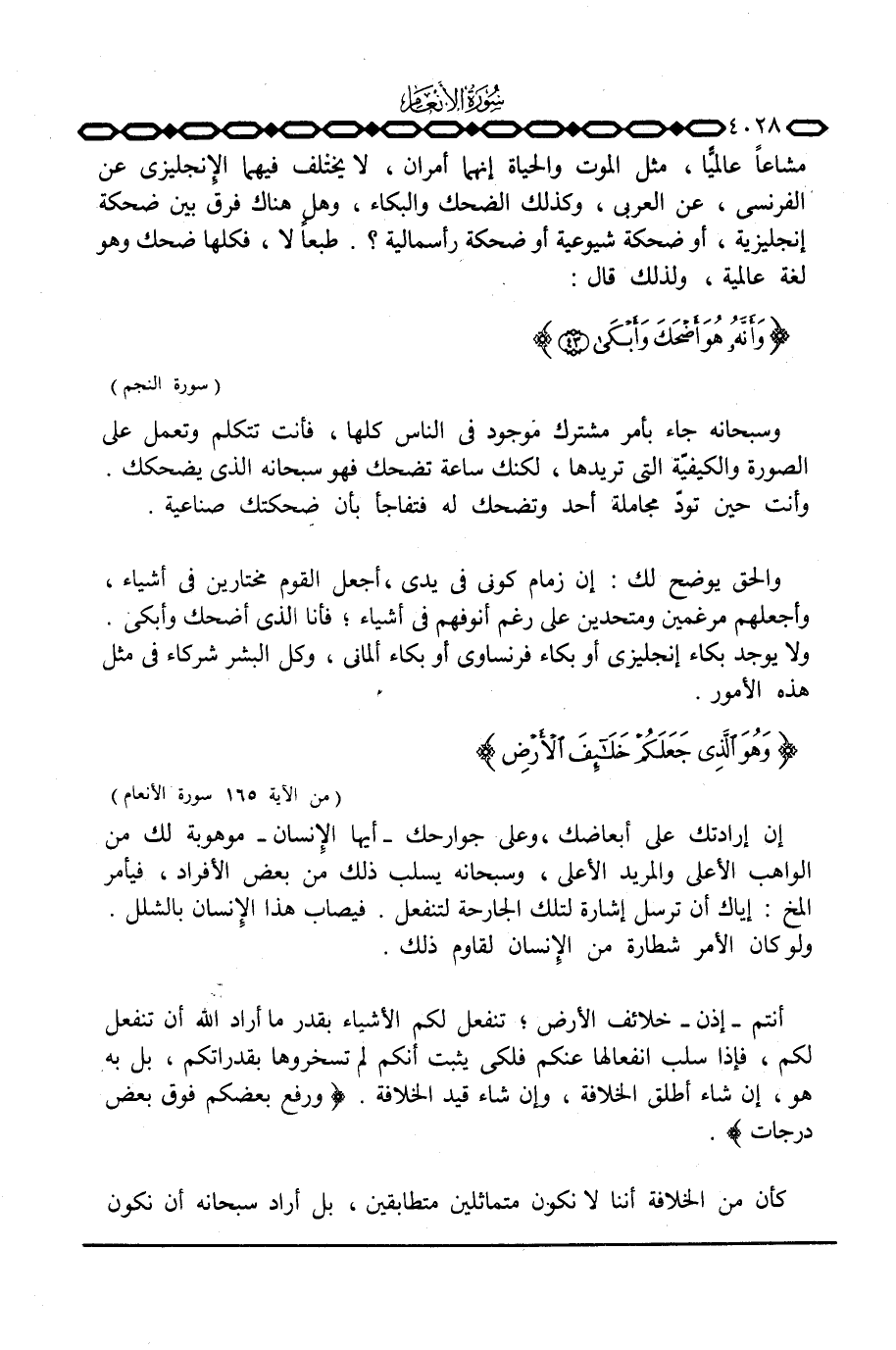 والحق يوضح لك: إن زمام كوني في يدي، أجعل القوم مختارين في أشياء، وأجعلهم مرغمين ومتحدين على رغم أنوفهم في أشياء؛ فأنا الذي أضحك وأبكي. ولا يوجد بكاء إنجليزي أو بكاء فرنساوي أو بكاء ألماني، وكل البشر شركاء في مثل هذه الأمور. {وَهُوَ الذي جَعَلَكُمْ خَلاَئِفَ الأرض ... } [الأنعام: 165]
