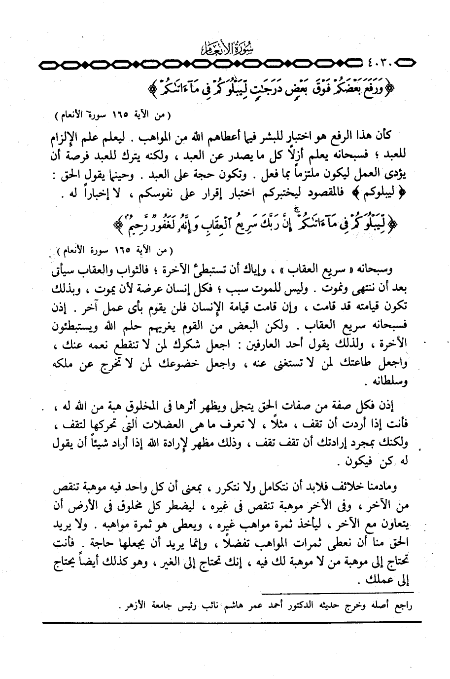 كأن هذا الرفع هو اختبار للبشر فيما أعطاهم الله من الواهب. ليعلم علم الإلزام للعبد؛ فسبحانه يعلم أزلاً كل ما يصدر عن العبد، ولكنه يترك للعبد فرصة أن يؤدي العمل ليكون ملتزماً بم فعل. وتكون حجة على العبد. وحينما يقول الحق: {لِّيَبْلُوَكُمْ} فالمقصود ليختبركم اختبار إقرار على نفوسكم، لا إخباراً له. { ... لِّيَبْلُوَكُمْ فِي مَآ آتَاكُمْ إِنَّ رَبَّكَ سَرِيعُ العقاب وَإِنَّهُ لَغَفُورٌ رَّحِيمٌ} [الأنعام: 165]