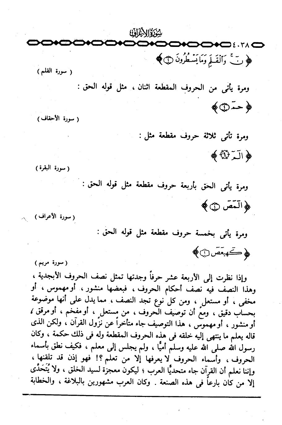 وإذا نظرت إلى الأربعة عشر حرفاً وجدتها تمثل نصف الحروف الأبجدية، وهذا النصف فيه نصف أحكام الحروف، فبعضها منشور، أو مهموس، أو مخفي، أو مستعلٍ، ومن كل نوع تجد النصف، مما يدل على أنها موضوعة بحساب دقيق، ومع أن توصيف الحروف، من مستعل، أو مفخم، أو مرقق، أو منشور، أو مهموس، هذا التوصيف جاء متأخراً عن نزول القرآن، ولكن الذي قاله يعلم ما ينتهي إليه خلقه في هذه الحروف المقطعة وله في ذلك حكمة، وكان رسول الله صَلَّى اللَّهُ عَلَيْهِ وَسَلَّم َ أميَّا، ولم يجلس إلى معلم، فكيف نطق بأسماء الحروف، وأسماء الحروف لا يعرفها إلا من تعلم؟! فهو إذن قد تلقنها، وإننا نعلم أن القرآن جاء متحديَّا العرب؛ ليكون معجزة لسيد الخلق، ولا يُتَحَدَّى إلا من كان بارعاً في هذه الصنعة.