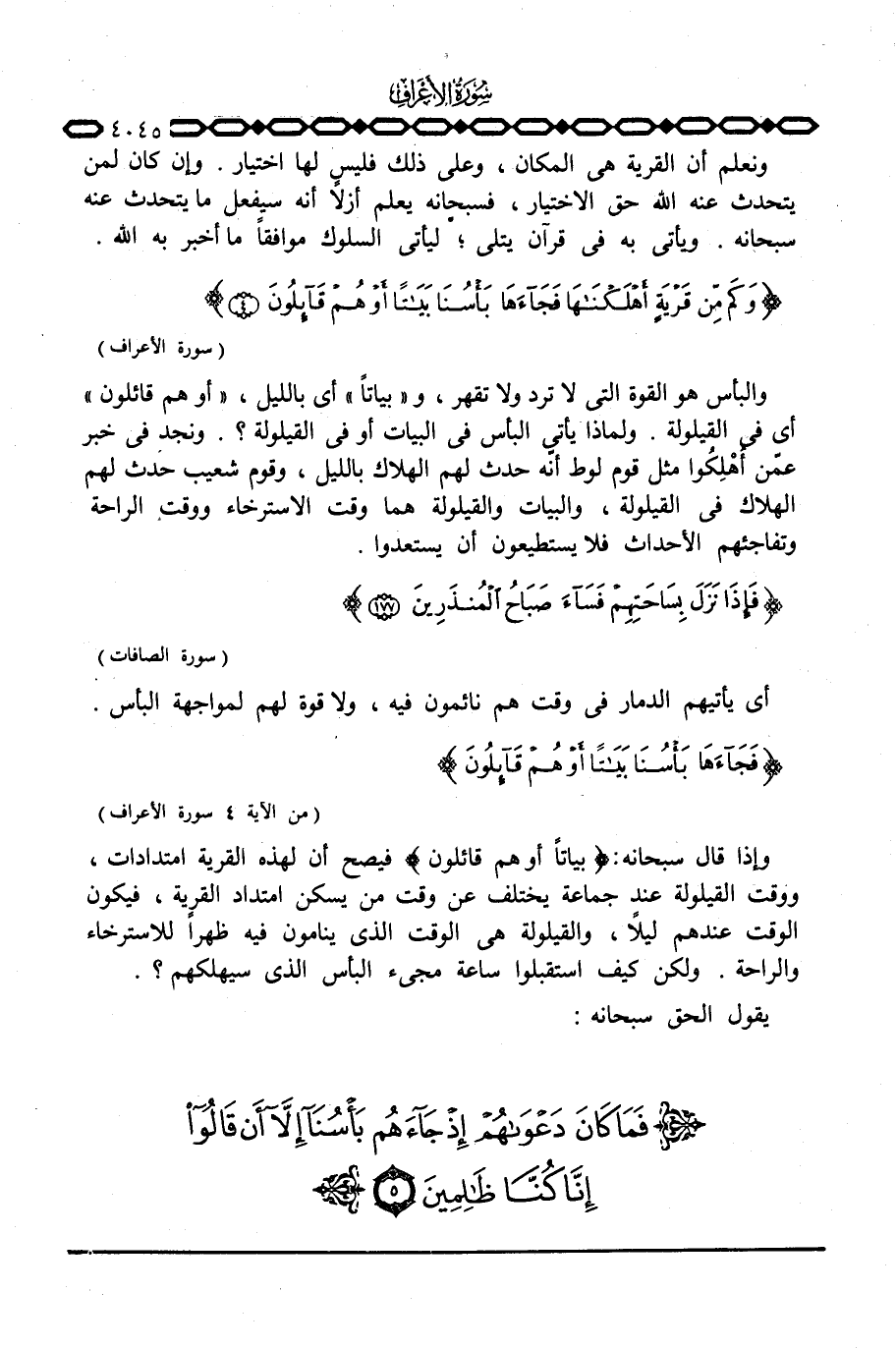 والبأس هو القوة التي ترد ولا تقهر، و «بيتاً» أي بالليل، {أَوْ هُمْ قَآئِلُونَ} أي في القيلولة. ولماذا يأتي البأس في البيات أو في القيلولة؟ . ونجد في خبر عمّن أَهْلِكُوا مثل قوم لوط أنّه حدث لهم الهلاك بالليل، وقوم شعيب حدث لهم الهلاك في القيلولة، والبيات والقيلولة هما وقت الاسترخاء ووقت الراحة وتفاجئهم الأحداث فلا يستطيعون أن يستعدوا. {فَإِذَا نَزَلَ بِسَاحَتِهِمْ فَسَآءَ صَبَاحُ المنذرين} [الصافات: 177]