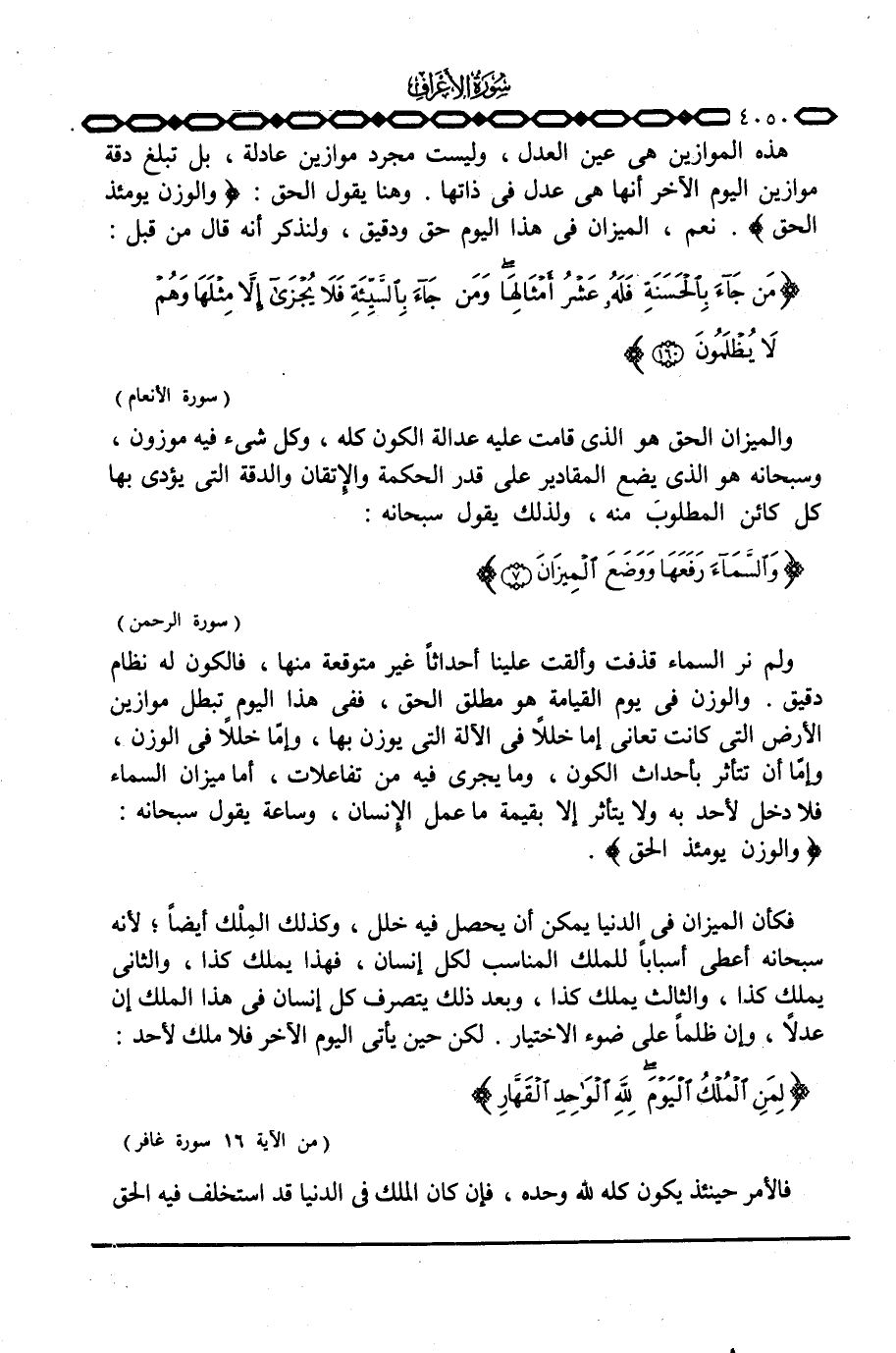 فكأن الميزان في الدنيا يمكن أن يحصل فيه خلل، وكذلك المِلْك أيضاً؛ لأنه سبحانه أعطى أسباباً للملك المناسب لكل إنسان، فهذا يملك كذا، والثاني يملك كذا، والثالث يملك كذا، وبعد ذلك يتصرف كل إنسان في هذا الملك إن عدلاً، وإن ظلماً على ضوء الاختيار. لكن حين يأتي اليوم الآخر فلا ملك لأحد: { ... لِّمَنِ الملك اليوم لِلَّهِ الواحد القهار} [غافر: 16]