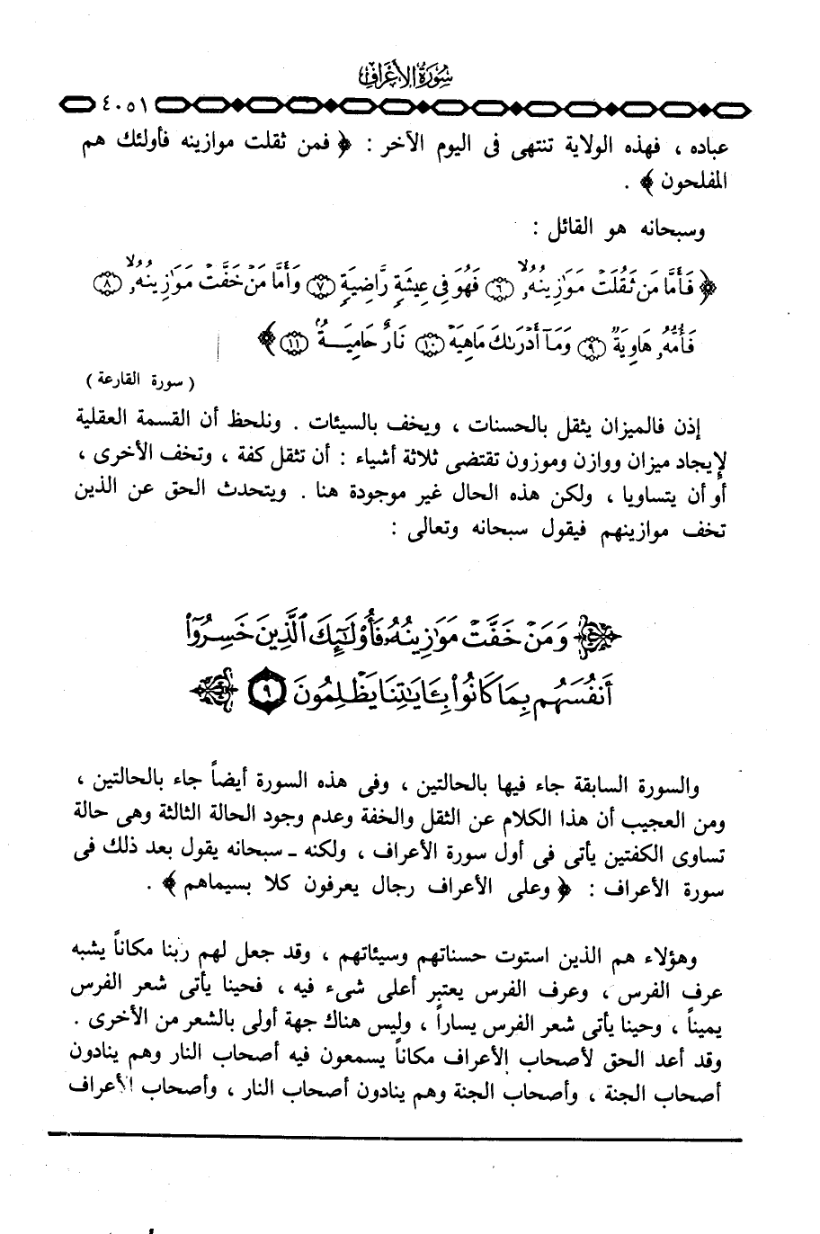 والسورة السابقة جاء فيها بالحالتين، وفي هذه السورة أيضاً جاء بالحالتين، ومن العجيب أن هذا الكلام عن الثقل والخفة وعدم وجود الحالة الثالثة وهي حالة تساوي الكفتين يأتي في أول سورة الأعراف، ولكنه - سبحانه يقول بعد ذلك في سورة الأعراف: {وَعَلَى الأعراف رِجَالٌ يَعْرِفُونَ كُلاًّ بِسِيمَاهُمْ} .