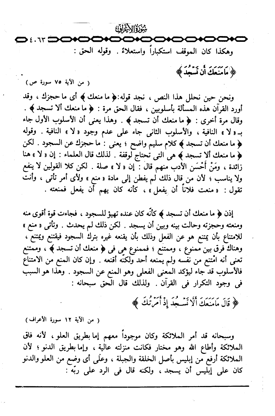 ونحن حين نحلل هذا النص، نجد قوله: {مَا مَنَعَكَ} أي ما حجزك، وقد أورد القرآن هذه المسألة بأسلوبين، فقال الحق مرة: {مَا مَنَعَكَ أَلاَّ تَسْجُدَ} . وقال مرة أخرى: {مَا مَنَعَكَ أَن تَسْجُدَ} . وهذا يعني أن الأسلوب الأول جاء ب «لا» النافية، والأسلوب الثاني جاء على عدم وجود «لا» النافية. وقوله {مَا مَنَعَكَ أَن تَسْجُدَ} كلام سليم واضح؛ يعني: ما حجزك عن السجود. لكن {مَا مَنَعَكَ أَلاَّ تَسْجُدَ} هي التي تحتاج لوقفة. لذلك قال العلماء: إن «لا» هنا زائدة، ومَنْ أَحْسَن الأدب منهم قال: إن «لا» صلة. لكن كلا القولين لا ينفع ولا يناسب؛ لأن من قال ذلك لم يفطن إلى مادة «منع» ولأي أمر تأتي، وأنت تقول: «منعت فلاناً أن يفعل» ، كأنه كان يهم أن يفعل فمنعته.