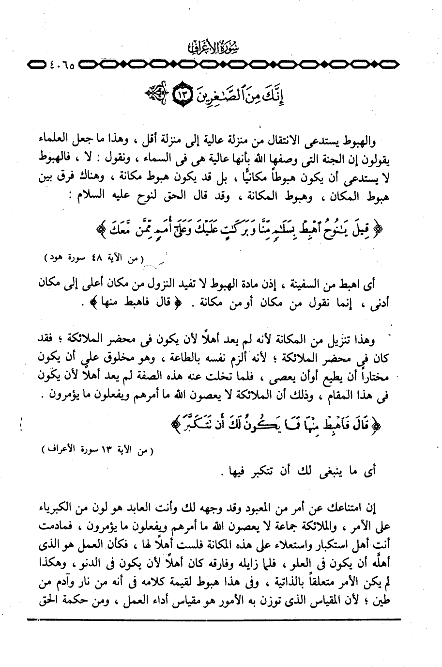 وهذا تنزيل من المكانة لأنه لم يعد أهلاً لأن يكون في محضر الملائكة؛ فقد كان في محضر الملائكة؛ لأنه الزم نفسه بالطاعة، وهو مخلوق على أن يكون مختارا أن يطيع أو أن يعصي، فلما تخلت عنه هذه الصفة لم يعد أهلاً لأن يكون في هذا المقام، وذلك أن الملائكة لا يعصون الله ما أمرهم ويفعلون ما يؤمرون. {قَالَ فاهبط مِنْهَا فَمَا يَكُونُ لَكَ أَن تَتَكَبَّرَ ... } [الأعراف: 13]