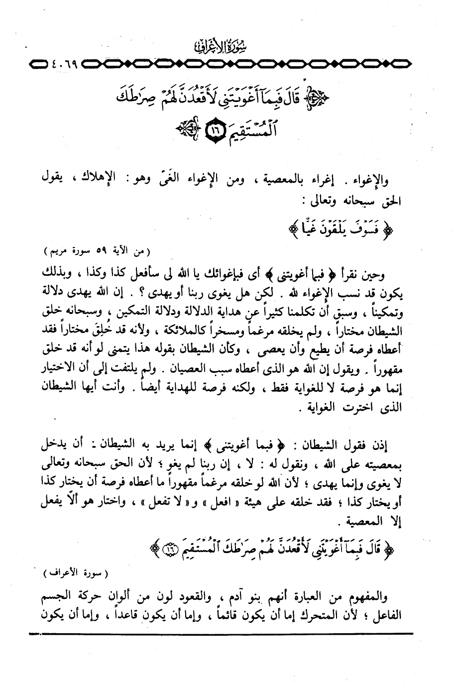 وحين نقرأ {فَبِمَآ أَغْوَيْتَنِي} أي فبإغوائك يا الله لي سأفعل كذا وكذا، وبذلك يكون قد نسب الإغواء لله لكن هل يغوي ربنا أو يهدي؟ . إن الله يهدي دلالة وتمكيناً، وسبق أن تكلمنا كثيراً عن هداية الدلالة ودلالة التمكين، وسبحانه خلق الشيطان مختاراً، ولم يخلقه مرغماً ومسخراً كالملائكة، ولأنه قد خلق مختاراً فقد أعطاه فرصة أن يطيع وأن يعصي، وكأن الشيطان بقوله هذا يتمنى لو أنه قد خلق مقهوراً. ويقول إن الله هو الذي أعطاه سبب العصيان. ولم يلتفت إلى أن الاختيار إنما هو فرصة لا للغواية فقط، ولكنه فرصة للهداية أيضاً. وأنت أيها الشيطان الذي اخترت الغواية.