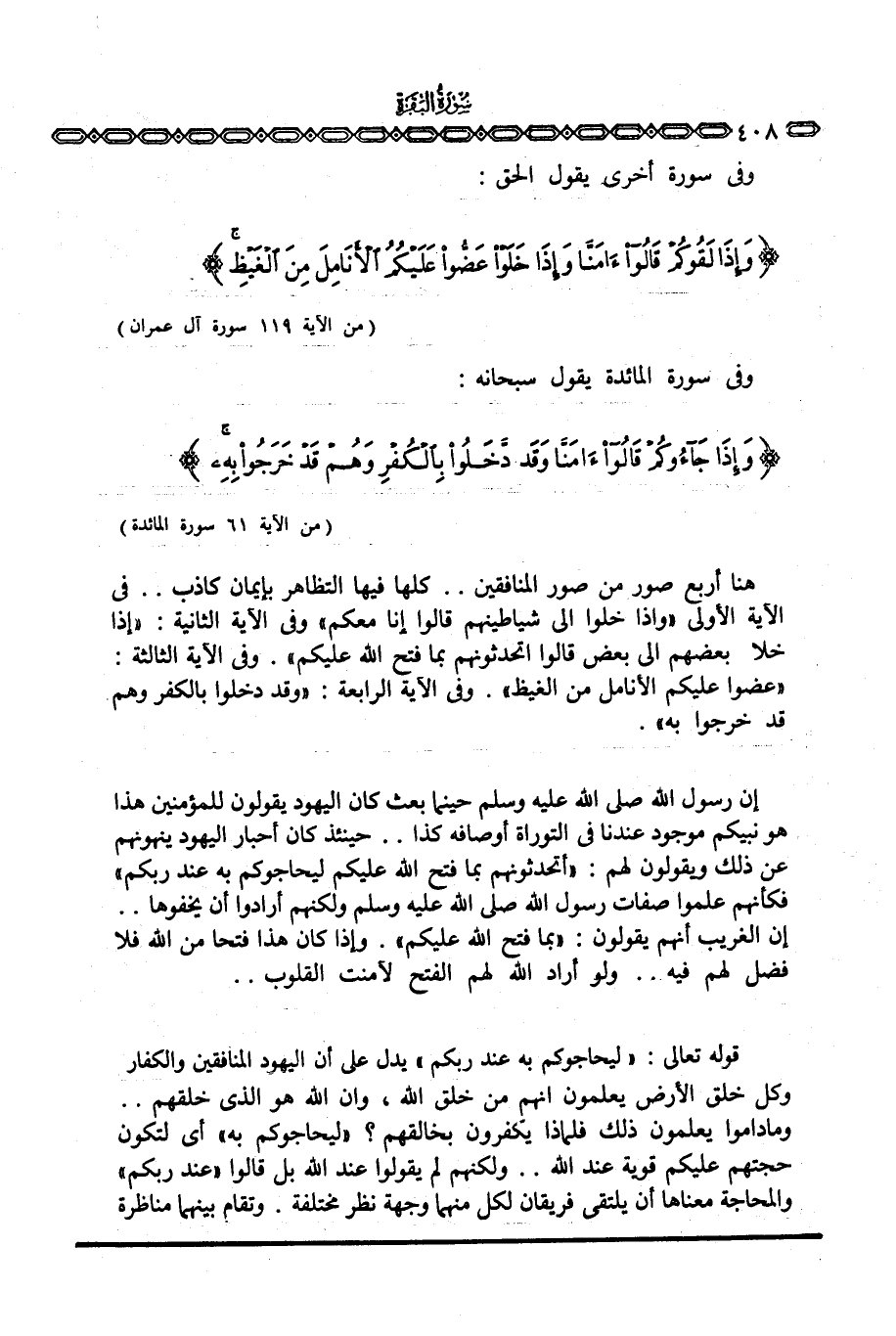 وفي سورة أخرى يقول الحق: {وَإِذَا لَقُوكُمْ قالوا آمَنَّا وَإِذَا خَلَوْاْ عَضُّواْ عَلَيْكُمُ الأنامل مِنَ الغيظ} [آل عمران: 119]