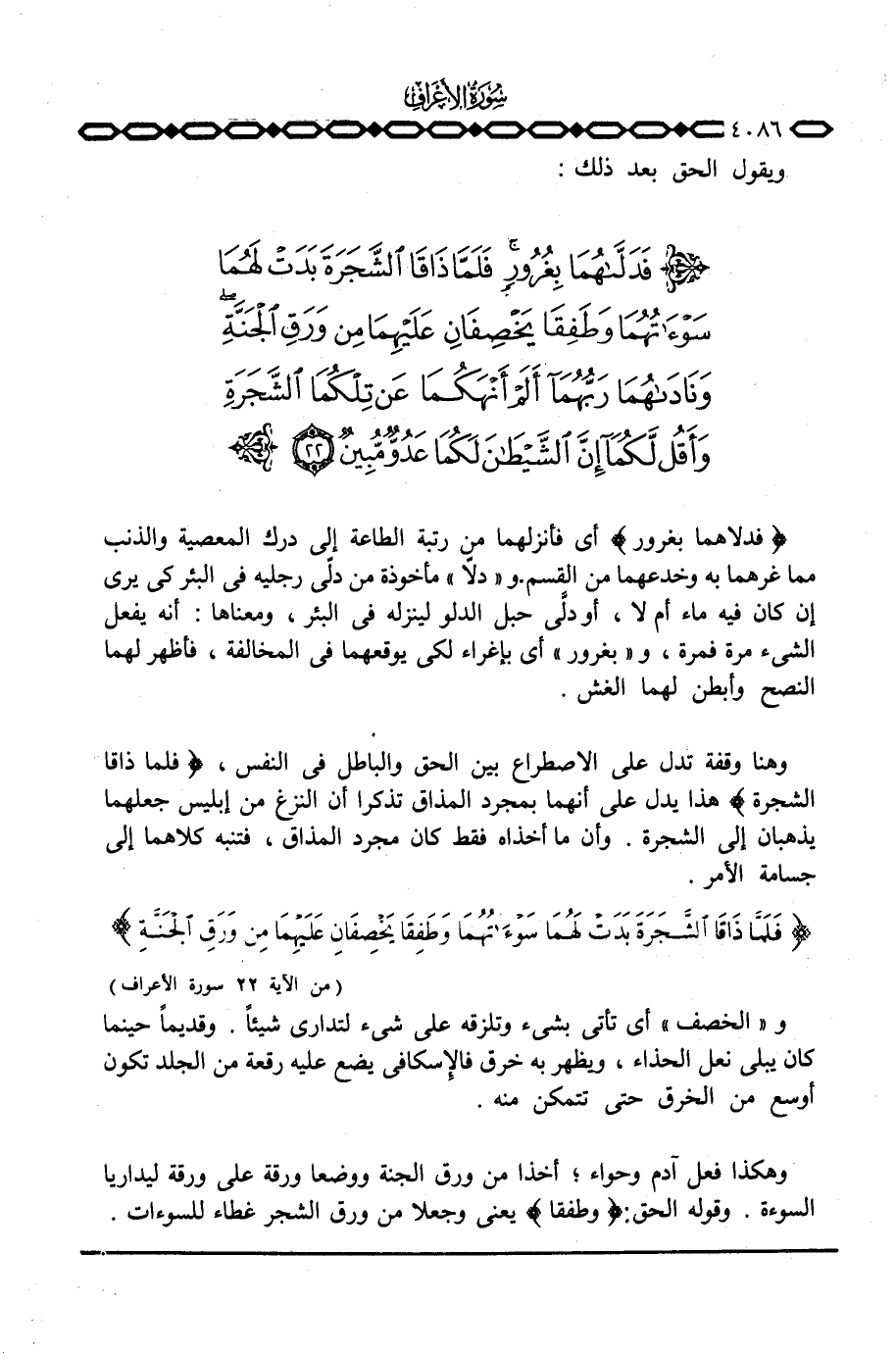 وهنا وقفة تدل على الاصطراع بين الحق والباطل في النفس، {فَلَمَّا ذَاقَا الشجرة} هذا يدل على أنهما بمجرد المذاق تذكرا أن النزغ من إبليس جعلهما يذهبان إلى الشجرة. وأن ما أخذاه فقط كان مجرد المذاق، فتنبه كلاهما إلى جسامة الأمر. {فَلَمَّا ذَاقَا الشجرة بَدَتْ لَهُمَا سَوْءَاتُهُمَا وَطَفِقَا يَخْصِفَانِ عَلَيْهِمَا مِن وَرَقِ الجنة} [الأعراف: 22]