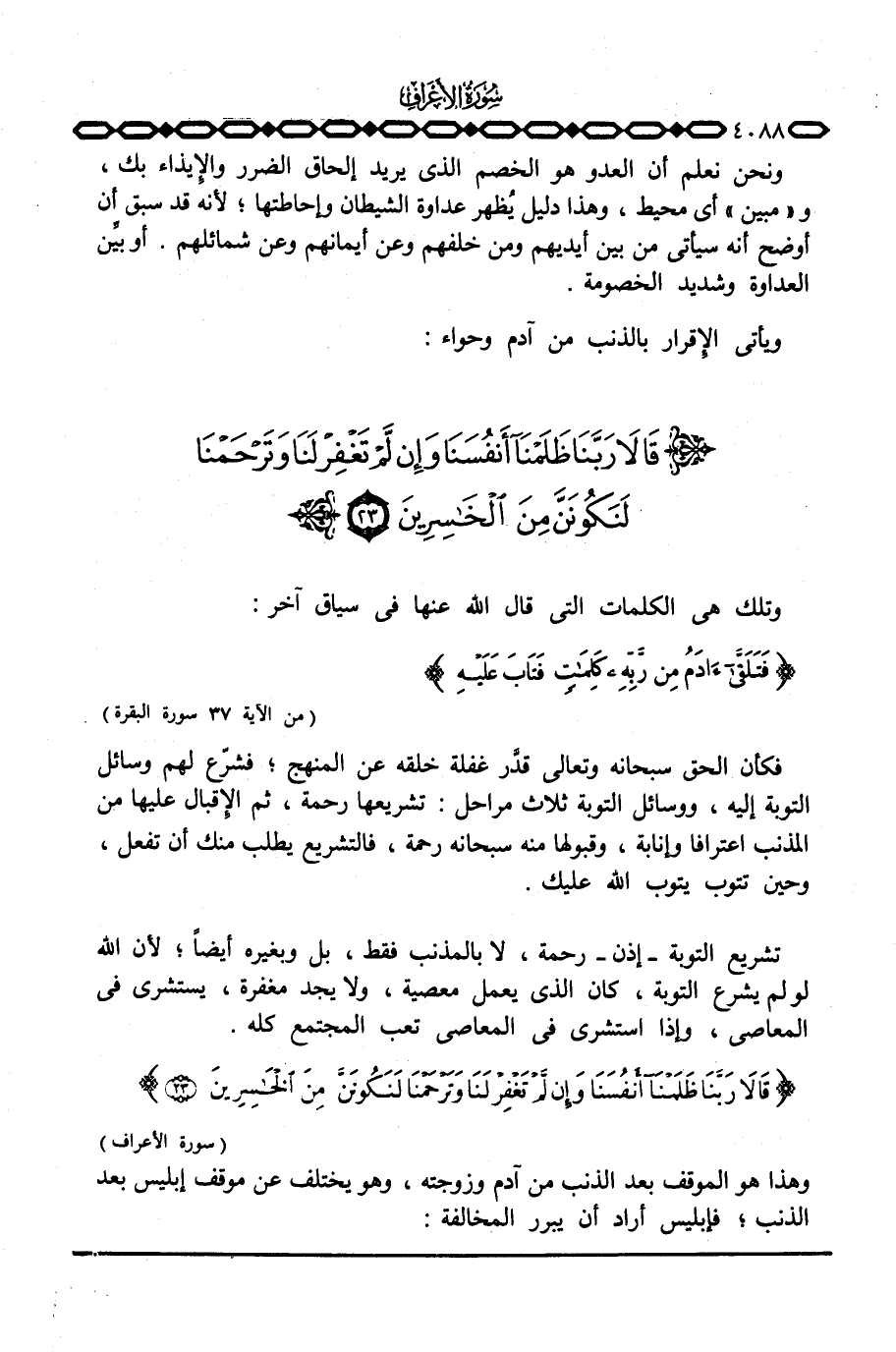 وهذا هو الموقف بعد الذنب من آدم وزوجته، وهو يختلف عن موقف إبليس بعد الذنب؛ فإبليس أراد أن يبرر المخالفة: