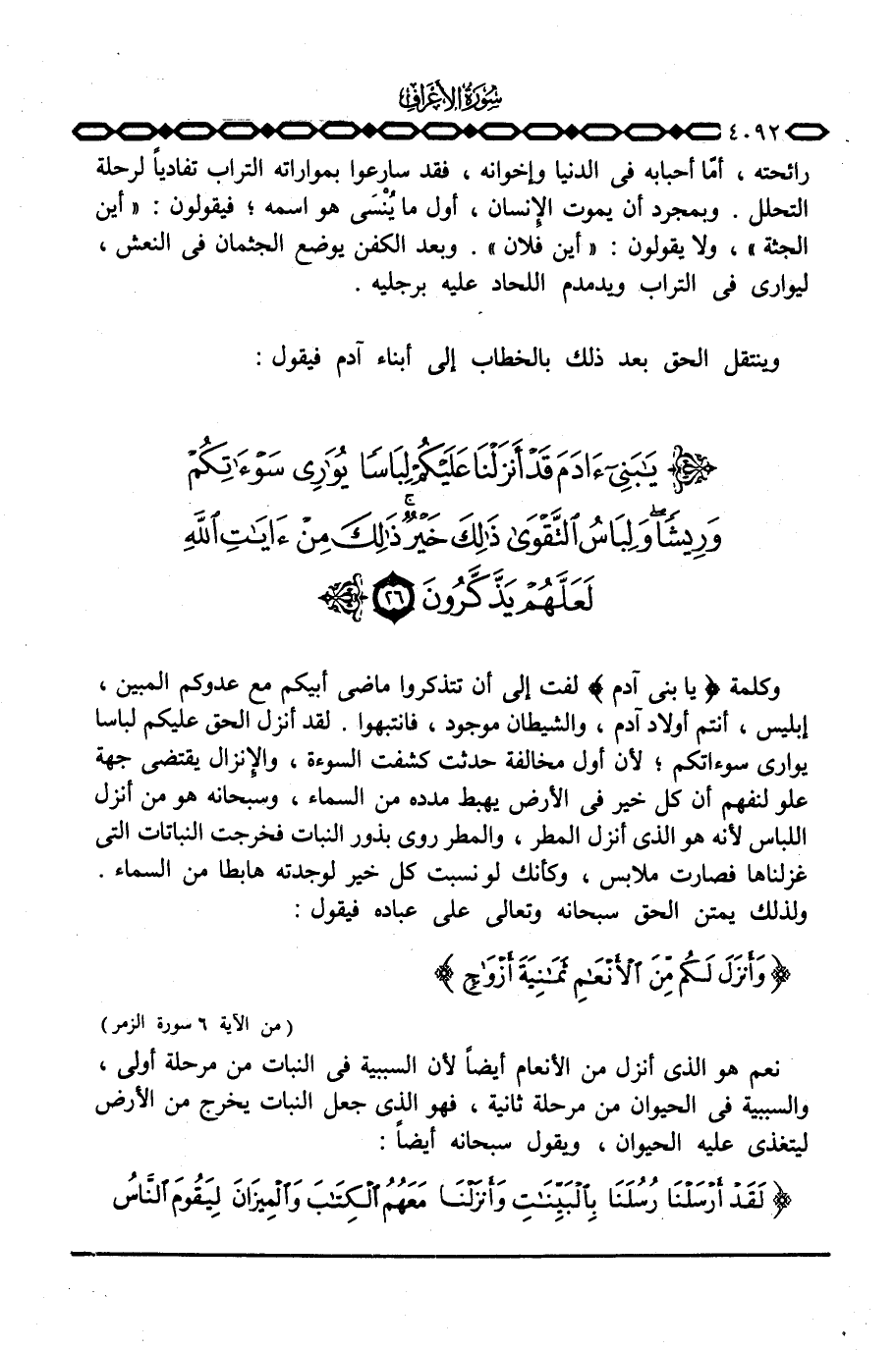 وكلمة {يابنيءَادَمَ} لفت إلى أن تتذكروا ماضي أبيكم مع عدوكم المبين، إبليس، أنتم أولاد آدم، والشيطان موجود، فانتبهوا. لقد أنزل الحق عليكم لباسا يواري سوءاتكم؛ لأن أول مخالفة حدثت كشفت السوءة، والإنزال يقتضي جهة علو لنفهم أن كل خير في الأرض يهبط مدده من السماء، وسبحانه هو من أنزل اللباس لأنه هو الذي أنزل المطر، والمطر روى بذور النبات فخرجت النباتات التي غزلناها فصارت ملابس، وكأنك لو نسبت كل خير لوجدته هابطا من السماء. ولذلك يمتن الحق سبحانه وتعالى على عباده فيقول: {وَأَنزَلَ لَكُمْ مِّنَ الأنعام ثَمَانِيَةَ أَزْوَاجٍ ... } [الزمر: 6]