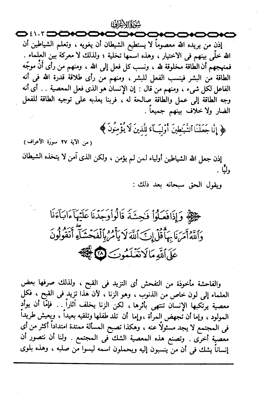 إذن من يريده الله معصوماً لا يستطيع الشيطان أن يغويه، وتعلم الشياطين أن الله خلّى بينهم في الاختيار، هذه اسمها تخلية؛ ولذلك لا معركة بين العلماء. فمنهجهم أن الطاقة مخلوقة لله، ونسب كل فعل إلى الله، ومنهم من رأى أنَّ موجّه الطاقة من البشر فينسب الفعل للبشر، ومنهم من رأى طلاقة قدرة الله في أنه الفاعل لكل شيء، ومنهم من قال: إن الإنسان هو الذي فعل المعصية. . أي أنه وجه الطاقة إلى عمل والطاقة صالحة له، فربنا يعذبه على توجيه الطاقة للفعل الضار ولا خلاف بينهم جميعاً. { ... إِنَّا جَعَلْنَا الشياطين أَوْلِيَآءَ لِلَّذِينَ لاَ يُؤْمِنُونَ} [الأعراف: 27]
