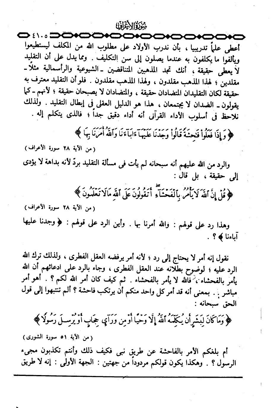 والرد من الله عليهم أنه سبحانه لم يأت في مسألة التقليد بردّ لأنه بداهة لا يؤدي إلى حقيقة، بل قال: { ... قُلْ إِنَّ الله لاَ يَأْمُرُ بالفحشآء أَتَقُولُونَ عَلَى الله مَا لاَ تَعْلَمُونَ} [الأعراف: 28]