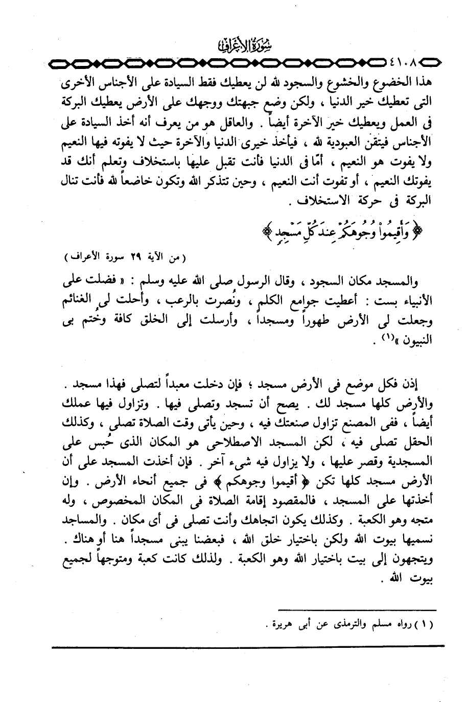 والمسجد مكان السجود، وقال الرسول صَلَّى اللَّهُ عَلَيْهِ وَسَلَّم َ: «فضلت على الأنبياء بست: أعطيت جوامع الكلم، ونُصرت بالرعب وأحلت لي الغنائم وجعلت لي الأرض طهوراً ومسجداً، وأرسلت إلى الخلق كافة وختم بي النبيون» .