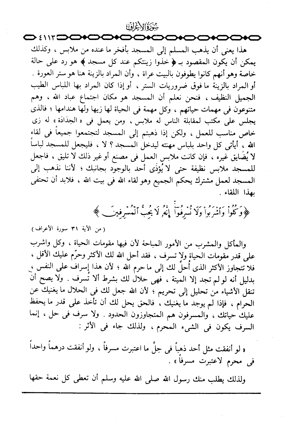 هذا يعني أن يذهب المسلم إلى المسجد بأفخر ما عنده من ملابس، وكذلك يمكن أن يكون المقصود ب {خُذُواْ زِينَتَكُمْ عِندَ كُلِّ مَسْجِدٍ} هو رد على حالة خاصة وهو أنهم كانوا يطوفون بالبيت عراة، وأن المراد بالزينة هنا هو ستر العورة. أو المراد بالزينة ما فوق ضروريات الستر، أو إذا كان المراد بها اللباس الطيب الجميل النظيف، فنحن نعلم أن المسجد هو مكان اجتماع عباد الله، وهم متنوعون في مهمات حياتهم، وكل مهمة في الحياة لها زيها ولها هندامها؛ فالذي يجلس على مكتب لمقابلة الناس له ملابس، ومن يعمل في «الحِدَادَة» له زي خاص مناسب للعمل، ولكن إذا ذهبتم إلى المسجد لتجتمعوا جميعاً في لقاء الله أيأتي كل واحد بلباس مهنته ليدخل المسجد؟ لا، فليجعل للمسجد لباساً لا يُضَايق غيره، فإن كانت ملابس العمل في مصنع أو غير ذلك لا تليق، فاجعل للمسجد ملابس نظيفة حتى لا يُؤذَي أحد بالوجود بجانبك؛ لأننا نذهب إلى المسجد لعمل مشترك يحكم الجميع وهو لقاء الله في بيت الله، فلابد أن تحتفي بهذا اللقاء. { ... وكُلُواْ واشربوا وَلاَ تسرفوا إِنَّهُ لاَ يُحِبُّ المسرفين} [الأعراف: 31]