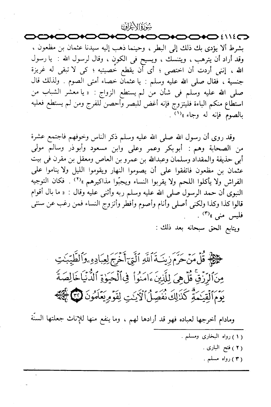 » وقد روي أن رسول الله صَلَّى اللَّهُ عَلَيْهِ وَسَلَّم َ ذكر الناس وخوفهم فاجتمع عشرة من الصحابة وهم: أبو بكر وعمر وعلي وابن مسعود وأبو ذر وسالم مولى أبي حذيفة والمقداد وسليمان وعبد الله بن عمرو بن العاص ومعقل بن مقرن في بيت عثمان بن مظعون فاتفقوا على أن يصوموا النهار ويقوموا الليل ولا يناموا على الفراش ولا يأكلوا اللحم ولا يقربوا النساء ويجبّوا مذاكيرهم «. فكان التوجيه النبوي أن حمد الرسول صَلَّى اللَّهُ عَلَيْهِ وَسَلَّم َ ربه وأثنى عليه وقال:» ما بال أقوام قالوا كذا وكذا ولكني أصلي وأنام وأصوم وأفطر وأتزوج النساء فمن رغب عن سنتي فليس مني «.