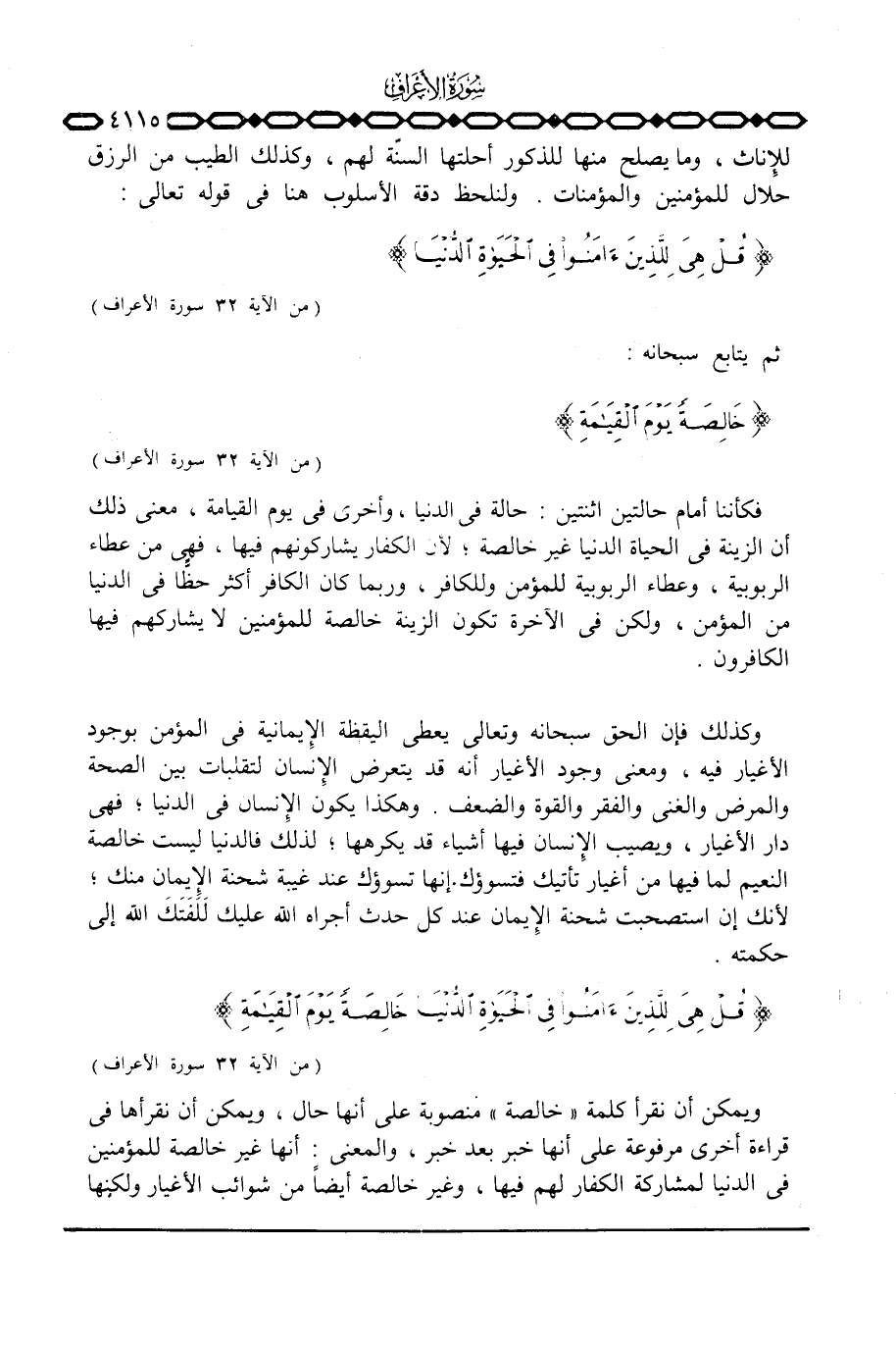 ويمكن أن نقرأ كلمة «خالصة» منصوبة على أنها حال، ويمكن أن نقرأها في قراءة أخرى مرفوعة على أنها خبر بعد خبر، والمعنى: أنها غير خالصة للمؤمنين في الدنيا لمشاركة الكفار لهم فيها، وغير خالصة أيضاً من شوائب الأغيار ولكنها