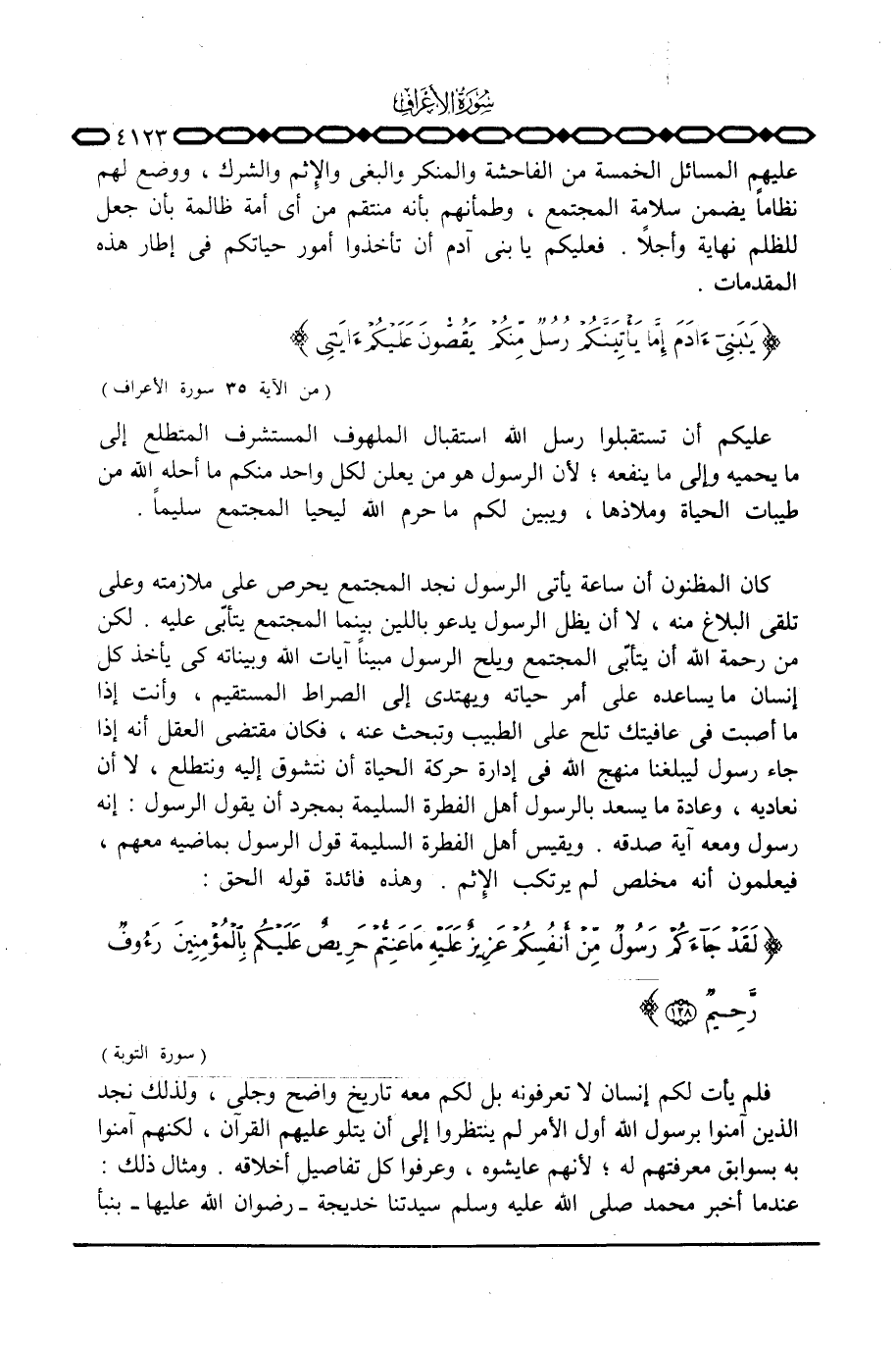 عليهم المسائل الخمسة من الفاحشة والمنكر والبغي والإِثم والشرك، ووضع لهم نظاماً يضمن سلامة المجتمع، وطمأنهم بأنه منتقم من أي أمة ظالمة بأن جعل للظلم نهاية وأجلاً. فعليكم يا بني آدم أن تأخذوا أمور حياتكم في إطار هذه المقدمات. {يابنيءَادَمَ إِمَّا يَأْتِيَنَّكُمْ رُسُلٌ مِّنكُمْ يَقُصُّونَ عَلَيْكُمْ آيَاتِي ... } [الأعراف: 35]