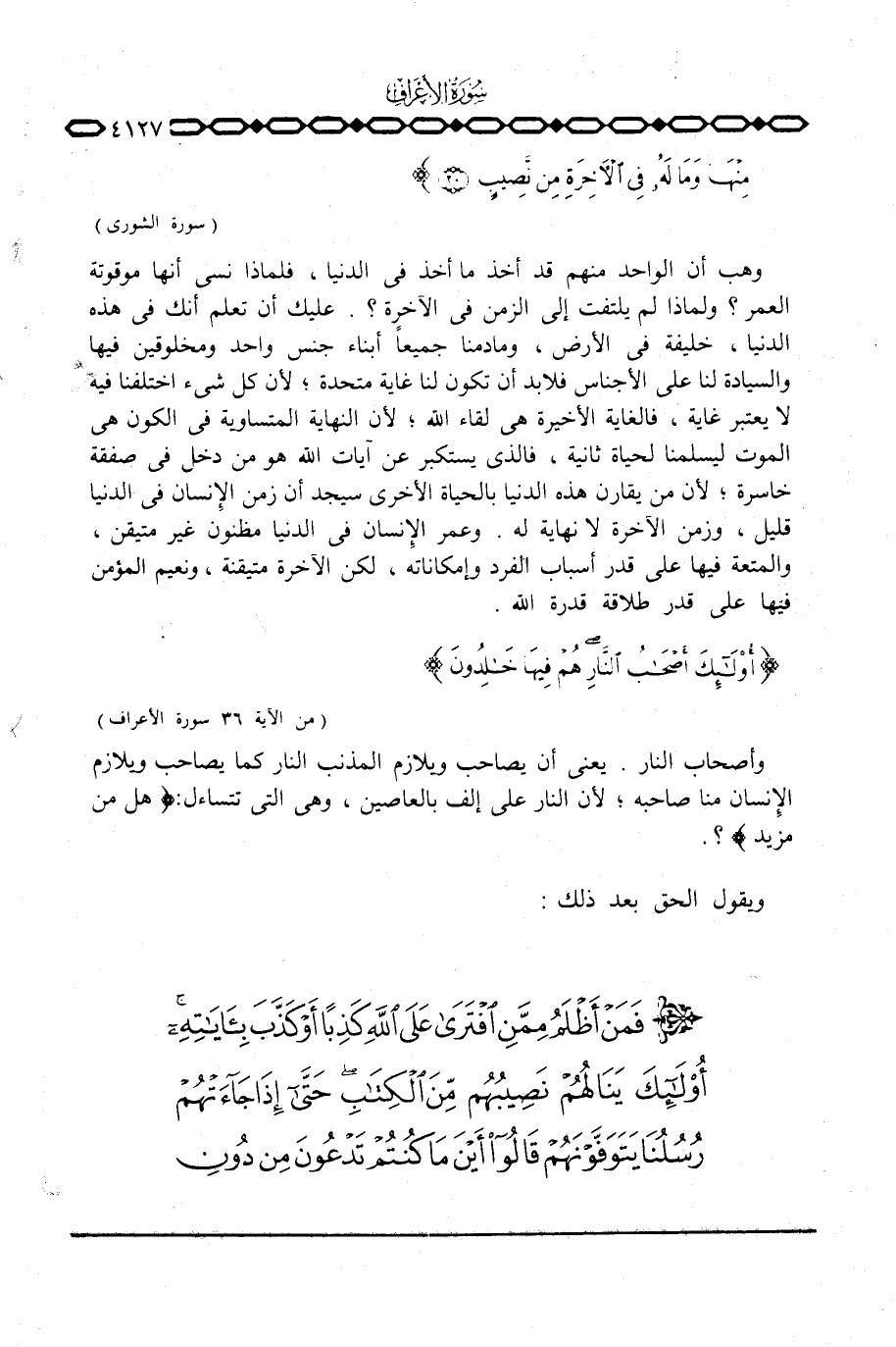 وهب أن الواحد منهم قد أخذ ما أخذ في الدنيا، فلماذا نسي أنها موقوتة العمر؟ ولماذا لم يلتفت إلى الزمن في الآخرة؟ . عليك أن تعلم أنك في هذه الدنيا، خليفة في الأرض، ومادمنا جميعاً أبناء جنس واحد ومخلوقين فيها والسيادة لنا على الأجناس فلابد أن تكون لنا غاية متحدة؛ لأن كل شيء اختلفنا فيه لا يعتبر غاية، فالغاية الأخيرة هي لقاء الله؛ لأن النهاية المتساوية في الكون هي الموت ليسلمنا لحياة ثانية، فالذي يستكبر عن آيات الله هو من دخل في صفقة خاسرة؛ لأن من يقارن هذه الدنيا بالحياة الأخرى سيجد أن زمن الإِنسان في الدنيا قليل، وزمن الآخرة لا نهاية له. وعمر الإِنسان في الدنيا مظنون غير متيقن، والمتعة فيها على قدر أسباب الفرد وإمكاناته، لكن الآخرة متيقنة، ونعيم المؤمن فيها على قدر طلاقة قدرة الله. {أولئك أَصْحَابُ النار هُمْ فِيهَا خَالِدُونَ} [الأعراف: 36]