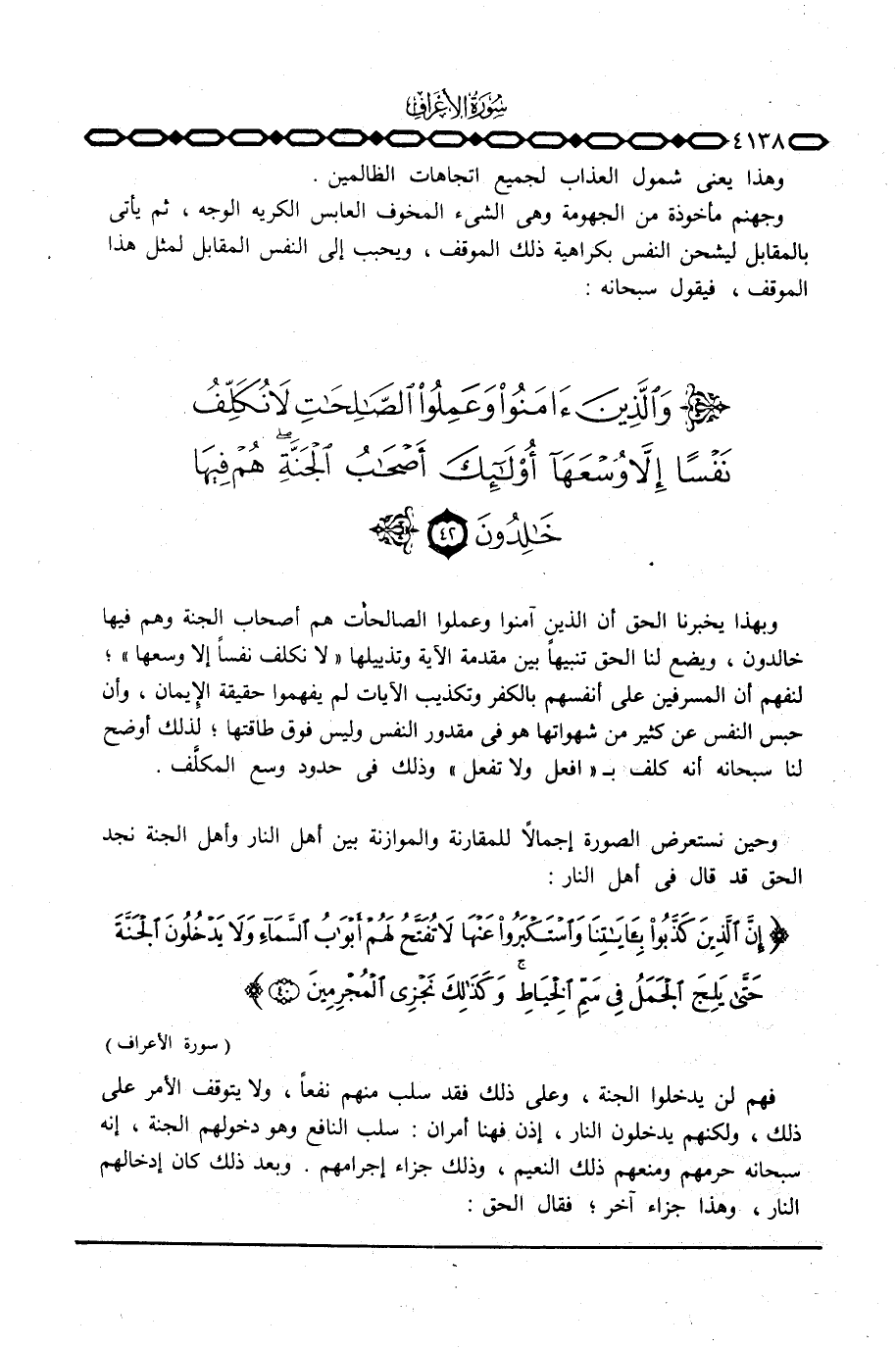 وبهذا يخبرنا الحق أن الذين آمنوا وعملوا الصالحات هم أصحاب الجنة وهم فيها خالدون، ويضع لنا الحق تنبيهاً بين مقدمة الآية وتذييلها {لاَ نُكَلِّفُ نَفْساً إِلاَّ وُسْعَهَا} ؛ لنفهم أن المسرفين على أنفسهم بالكفر وتكذيب الآيات لم يفهموا حقيقة الإِيمان، وأن حبس النفس عن كثير من شهواتها هو في مقدور النفس وليس فوق طاقتها؛ لذلك أوضح لنا سبحانه أنه كلف ب «افعل ولا تفعل» وذلك في حدود وسع المكلَّف.