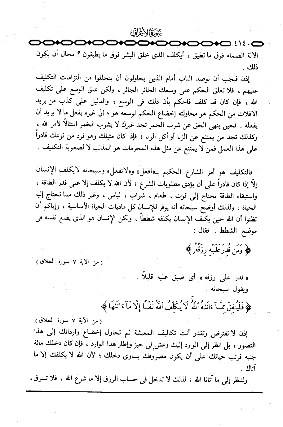 إذن فيجب أن نوصد الباب أمام الذين يحاولون أن يتحللوا من التزامات التكليف عليهم، فلا تعلق الحكم على وسعك الخائر الجائر، ولكن غلق الوسع على تكليف الله، فإن كان قد كلف فأحكم لأن ذلك في الوسع؛ والدليل على كذب من يريد الافلات من الحكم هو محاولته إخضاع الحكم لوسعه هو؛ أن غيره يفعل ما لا يريد أن يفعله. فحين ينهى الحق عن شرب الخمر تجد غيرك لا يشرب الخمر امتثالاً لأمر الله، وكذلك تجد من يمتنع عن الزنا أو أكل الربا؛ فإذا كان مثيلك وهو فرد من نوعك قادراً على هذا العمل فمن لا يمتنع عن مثل هذه المحرمات هو المذنب لا لصعوبة التكليف.