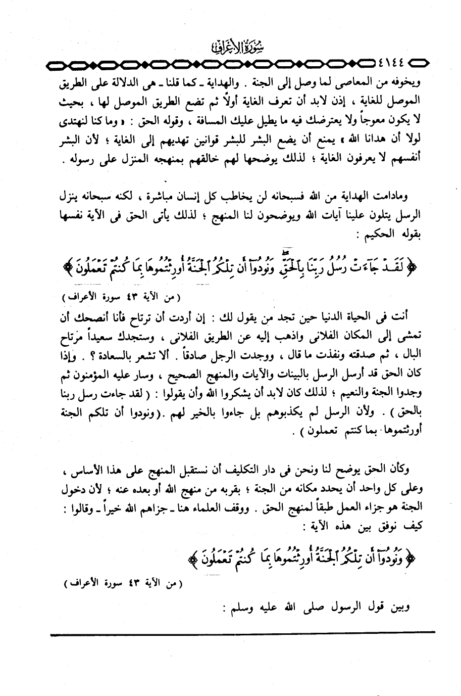 وكأن الحق يوضح لنا ونحن في دار التكليف أن نستقبل المنهج على هذا الأساس، وعلى كل واحد أن يحدد مكانه من الجنة؛ بقربه من منهج الله أو بعده عنه؛ لأن دخول الجنة هو جزاء العمل طبقاً لمنهج الحق.