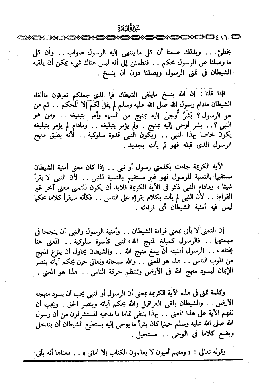 وكلمة تمني في هذه الآية الكريمة بمعنى أن الرسول أو النبي يحب أن يسود منهجه الأرض. . والشيطان يلقي العراقيل والله يحكم آياته وينصر الحق. ويجب أن نفهم الآية على هذا المعنى. . وبهذا ينتفي تماما ما يدعيه المستشرقون من أن رسول الله صَلَّى اللَّهُ عَلَيْهِ وَسَلَّم َ حينما كان يقرأ ما يوحى إليه يستطيع الشيطان أن يتدخل ويضع كلاما في الوحي. . مستحيل.