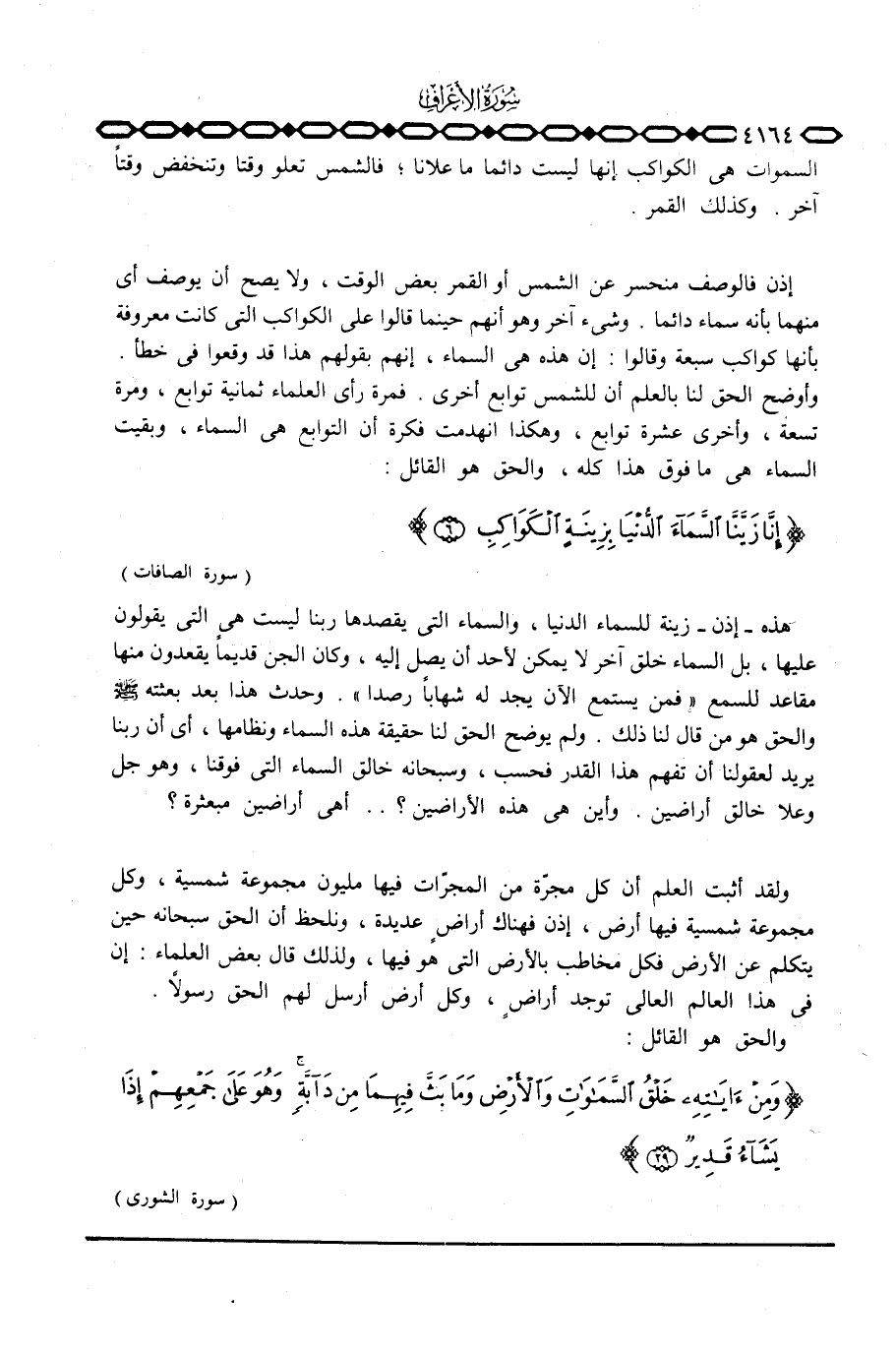هذه - إذن - زينة للسماء الدنيا، والسماء التي يقصدها ربنا ليست هي التي يقولون عليها، بل السماء خلق آخر لا يمكن لأحد أن يصل إليه، وكان الجن قديماً يقعدون منها مقاعد للسمع {فَمَن يَسْتَمِعِ الآن يَجِدْ لَهُ شِهَاباً رَّصَداً} . وحدث هذا بعد بعثته صَلَّى اللَّهُ عَلَيْهِ وَسَلَّم َ والحق هو من قال لنا ذلك. ولم يوضح الحق لنا حقيقة هذه السماء ونظامها، أي أن ربنا يريد لعقولنا أن تفهم هذا القدر فحسب، وسبحانه خالق السماء التي فوقنا، وهو جل وعلا خالق أراضين. وأين هي هذه الأراضين؟ . . أهي أراضين مبعثرة؟