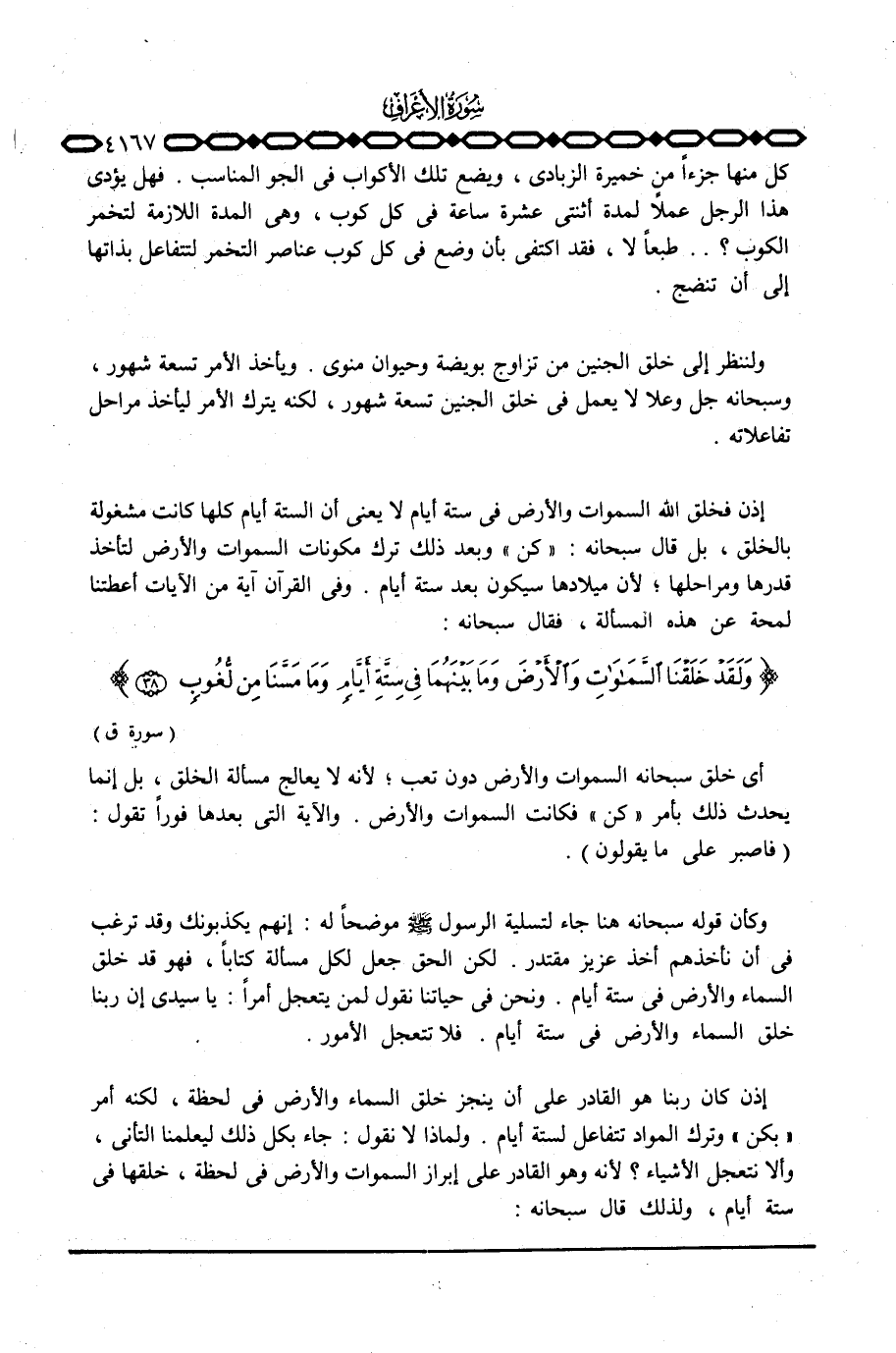 إذن كان ربنا هو القادر على أن ينجز خلق السماء والأرض في لحظة، لكنه أمر «بكن» وترك المواد تتفاعل لستة أيام. ولماذا لا نقول: جاء بكل ذلك ليعلمنا التأني، وألا نتعجل الأشياء؟ لأنه وهو القادر على إبراز السموات والأرض في لحظة، خلقها في ستة أيام، لذلك قال سبحانه: