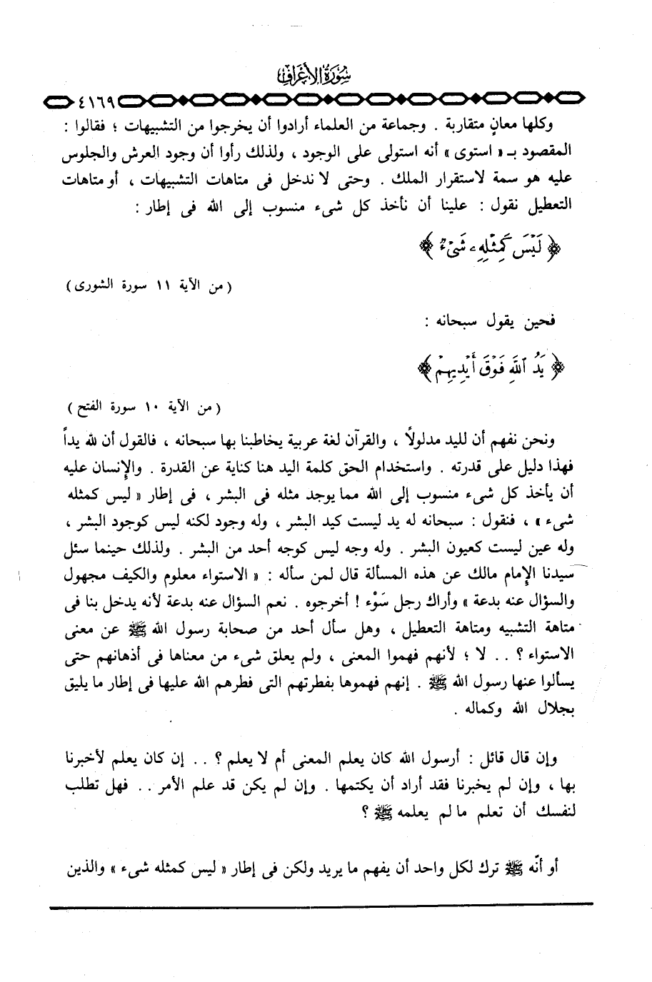 ونحن نفهم أن لليد مدلولاً، والقرآن لغة عربية يخاطبنا بها سبحانه، فالقول أن لله يداً فهذا دليل على قدرته. واستخدام الحق كلمة اليد هنا كناية عن القدرة. والإِنسان عليه أن يأخذ كل شيء منسوب إلى الله مما يوجد مثله في البشر، في إطار {لَيْسَ كَمِثْلِهِ شَيْءٌ} ، فنقول: سبحانه له يد ليست كيد البشر، وله وجود لكنه ليس كوجود البشر، وله عين ليست كعيون البشر. وله وجه ليس كوجه أحد من البشر. ولذلك حينما سئل سيدنا الإِمام مالك عن هذه المسألة قال لمن سأله: «الاستواء معلوم والكيف مجهول والسؤال عنه بدعة» وأراك رجل سَوْء! أخرجوه. نعم السؤال عنه بدعة لأنه يدخل بنا في متاهة التشبيه ومتاهة التعطيل، وهل سأل أحد من صحابة رسول الله صَلَّى اللَّهُ عَلَيْهِ وَسَلَّم َ عن معنى الاستواء؟ . . لا؛ لأنهم فهموا المعنى، ولم يعلق شيء من معناها في أذهانهم حتى يسألوا عنها رسول الله صَلَّى اللَّهُ عَلَيْهِ وَسَلَّم َ. إنهم فهموها بفطرتهم التي فطرهم الله عليها في إطار ما يليق بجلال الله وكماله.