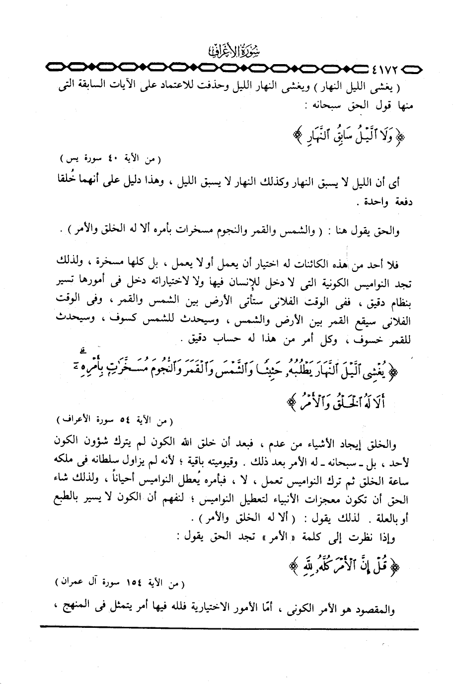 فلا أحد من هذه الكائنات له اختيار أن يعمل أو لا يعمل، بل كلها مسخرة، ولذلك تجد النواميس الكونية التي لا دخل للإنسان فيها ولاختياراته دخل في أمورها تسير بنظام دقيق، ففي الوقت الفلاني ستأتي الأرض بين الشمس والقمر، وفي الوقت الفلاني سيقع القمر بين الأرض والشمس، وسيحدث للشمس خسوف، وكل أمر من هذا له حساب دقيق. {يُغْشِي اليل النهار يَطْلُبُهُ حَثِيثاً والشمس والقمر والنجوم مُسَخَّرَاتٍ بِأَمْرِهِ أَلاَ لَهُ الخلق والأمر ... } [الأعراف: 54]