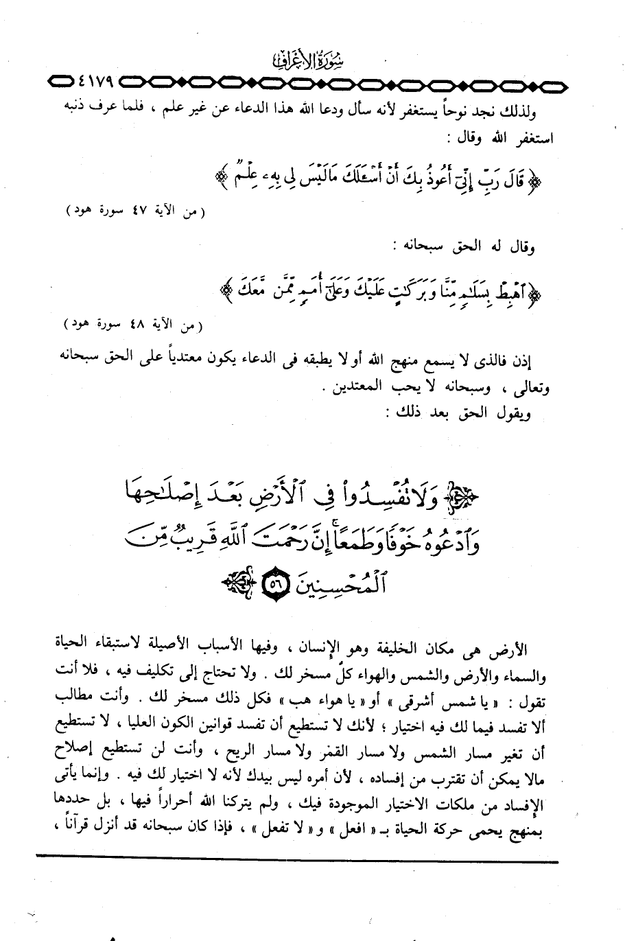 الأرض هي مكان الخليفة وهو الإِنسان، وفيها الأسباب الأصيلة لاستبقاء الحياة والسماء والأرض والشمس والهواء كلٌ مسخر لك. ولا تحتاج إلى تكليف فيه، فلا أنت تقول: «يا شمس أشرقي» أو «يا هواء هب» فكل ذلك مسخر لك. وأنت مطالب ألا تفسد فيما لك فيه اختيار؛ لأنك لا تستطيع أن تفسد قوانين الكون العليا، لا تستطيع أن تغير مسار الشمس ولا مسار القمر ولا مسار الريح، وأنت لن تستطيع إصلاح ما لا يمكن أن تقترب من إفساده، لأن أمره ليس بيدك لأنه لا اختيار لك فيه. وإنما يأتي الإِفساد من ملكات الاختيار الموجودة فيك، ولم يتركنا الله أحراراً فيها، بل حددها بمنهج يحمي حركة الحياة ب «افعل» و «لا تفعل» ، فإذا كان سبحانه قد أنزل قرآناً،