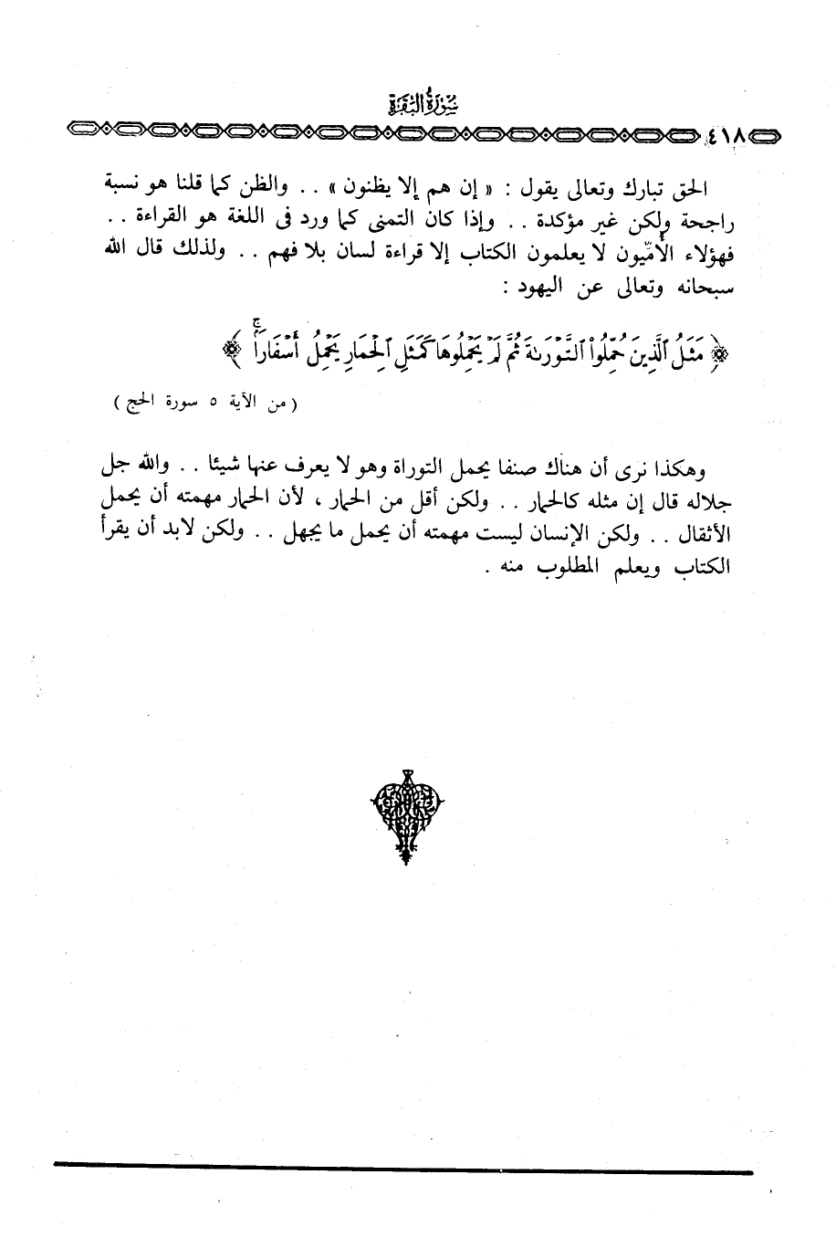 وهكذا نرى أن هناك صنفا يحمل التوراة وهو لا يعرف عنها شيئا. . والله جل جلاله قال إن مثله كالحمار. . ولكن أقل من الحمار، لأن الحمار مهمته أن يحمل الأثقال. . ولكن الإنسان ليست مهمته أن يحمل ما يجهل. . ولكن لابد أن يقرأ الكتاب ويعلم المطلوب منه.