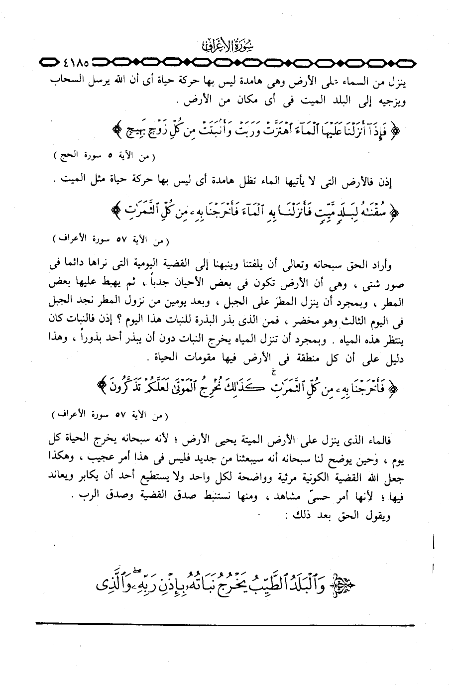 وأراد الحق سبحانه وتعالى أن يلفتنا وينبهنا إلى القضية اليويمية التي نراها دائما في صور شتى، وهي أن الأرض تكون في بعض الأحيان جدباً، ثم يهبط عليها بعض المطر، وبمجرد أن ينزل المطر على الجبل، وبعد يومين من نزول المطر نجد الجبل في اليوم الثالث وهو مخضر، فمن الذي بذر البذرة للنبات هذا اليوم؟ إذن فالنبات كان ينتظر هذه المياه، وبمجرد أن تنزل المياه يخرج النبات دون أن يبذر أحد بذوراً، وهذا دليل على أن كل منطقة في الأرض فيها مقومات الحياة. { ... فَأَخْرَجْنَا بِهِ مِن كُلِّ الثمرات كذلك نُخْرِجُ الموتى لَعَلَّكُمْ تَذَكَّرُونَ} [الأعراف: 57]
