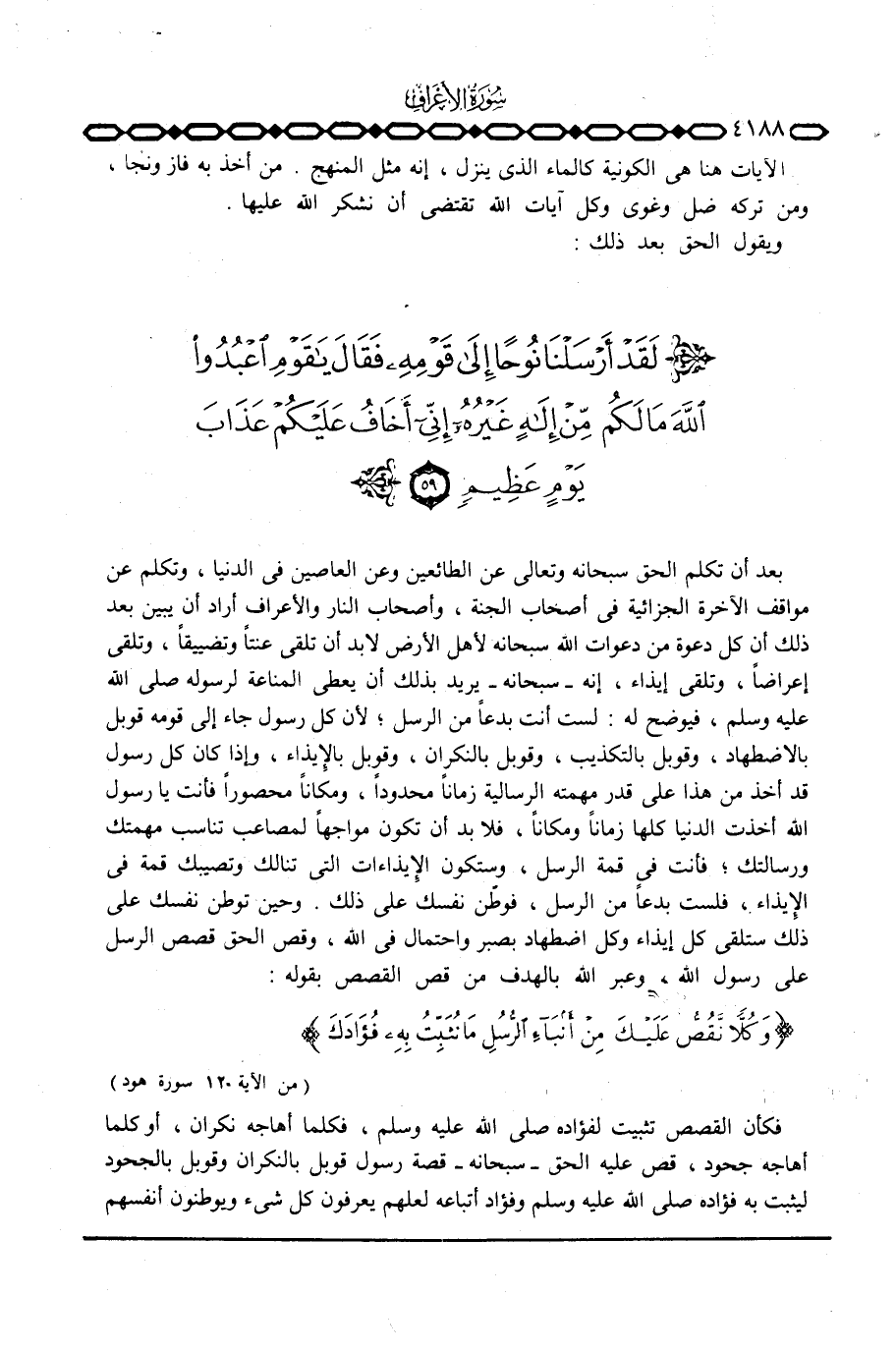 بعد أن تكلم الحق سبحانه وتعالى عن الطائعين وعن العاصين في الدنيا، وتكلم عن مواقف الآخرة الجزائية في أصحاب الجنة، وأصحاب النار والأعراف أراد أن يبين بعد ذلك أن كل دعوة من دعوات الله سبحانه أهل الأرض لابد أن تلقي عنتا وتضييقا، وتلقى إعراضاً، وتلقى إيذاء، إنه - سبحانه - يريد أن يعطي المناعة لرسوله صَلَّى اللَّهُ عَلَيْهِ وَسَلَّم َ، فيوضح له: لست أنت بادعاً من الرسل؛ لأن كل رسول جاء إلى قومه قوبل بالاضطهاد، وقوبل بالتكذيب، وقوبل بالنكرات، وقوبل بالإيذاء، وإذا كان كان كل رسول قد أخذ من هذا على قدر مهمته الرسالية زماناً محدوأ، ومكاناً محصوراً فأنت يا رسول الله أخذت الدنيا كلها زماناً ومكاناً، فلا بد أن تكون مواجهاً لمصاعب تناسب مهمتك ورسالتك؛ فأنت في قمة الرسل، وستكون الإيذاءات التي تنالك وتصيبك قمة في الإيذاء، فلست بدعاً من الرسل، فوطّن نفسك على ذلك. وحين توطن نفسك على ذلك ستلقى كل إيذاء وكل اضطهاد بصبر واحتمال في الله، وقص الحق قصص الرسل على رسول الله، وعبر الله بالهدف من قص القصص بقول: {وَكُلاًّ نَّقُصُّ عَلَيْكَ مِنْ أَنْبَاءِ الرسل مَا نُثَبِّتُ بِهِ فُؤَادَكَ ... } [هود: 120]