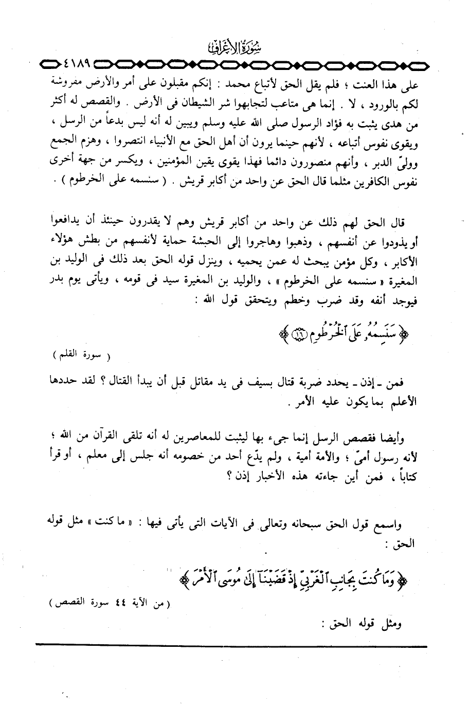على هذا العنت؛ فلم يقل الحق لأتباع محمد: إنكم مقبلون على أمر والأرض مفروشة لكم بالورود، لا. إنما هي متاعب لتجابهوا شر الشيطان في الأرض. والقصص له أكثر من هدى يثبت به فؤاد الرسول صَلَّى اللَّهُ عَلَيْهِ وَسَلَّم َ ويبين له أنه ليس بدعاً من الرسل، ويقوي نفوس أتباعه، لأنهم حينما يرون أن أهل الحق مع الأنبياء انتصروا، وهزم الجميع ووليّ الدبر، وأنهم منصورون دائما فهذا يقوي يقين المؤمنين، ويكسر من جهة أخرى نفوس الكافرين مثلما قال الحق عن واحد من أكابر قريش. {سَنَسِمُهُ عَلَى الخرطوم} .