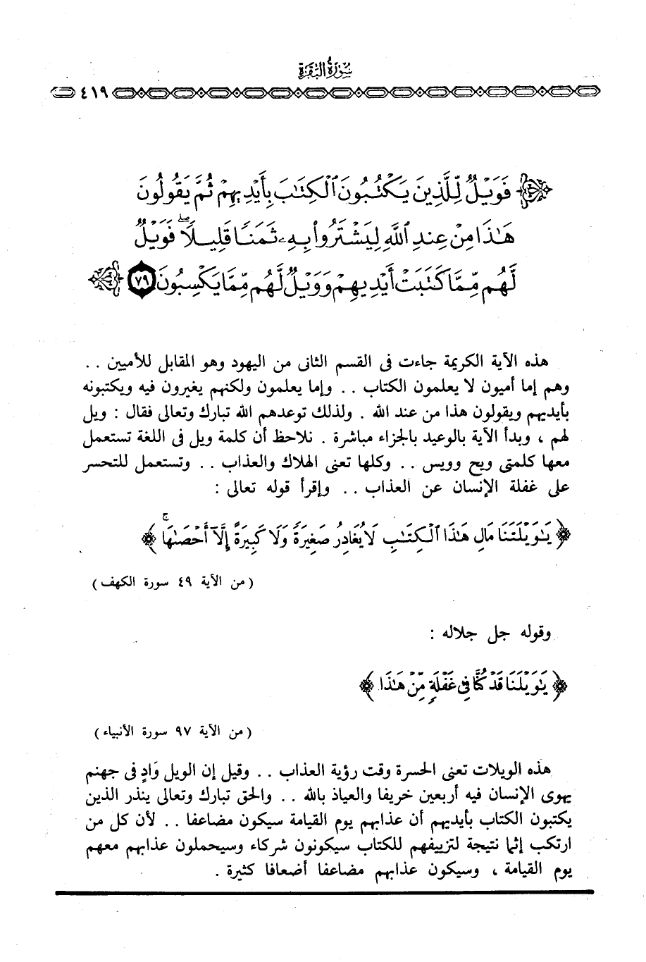 هذه الويلات تعني الحسرة وقت رؤية العذاب. . وقيل إن الويل وَادٍ في جهنم يهوي الإنسان فيه أربعين خريفا والعياذ بالله. . والحق تبارك وتعالى ينذر الذين يكتبون الكتاب بأيديهم أن عذابهم يوم القيامة سيكون مضاعفا. . لأن كل من ارتكب إثما نتيجة لتزييفهم للكتاب سيكونون شركاء وسيحملون عذابهم معهم يوم القيامة، وسيكون عذابهم مضاعفا أضعافا كثيرة.