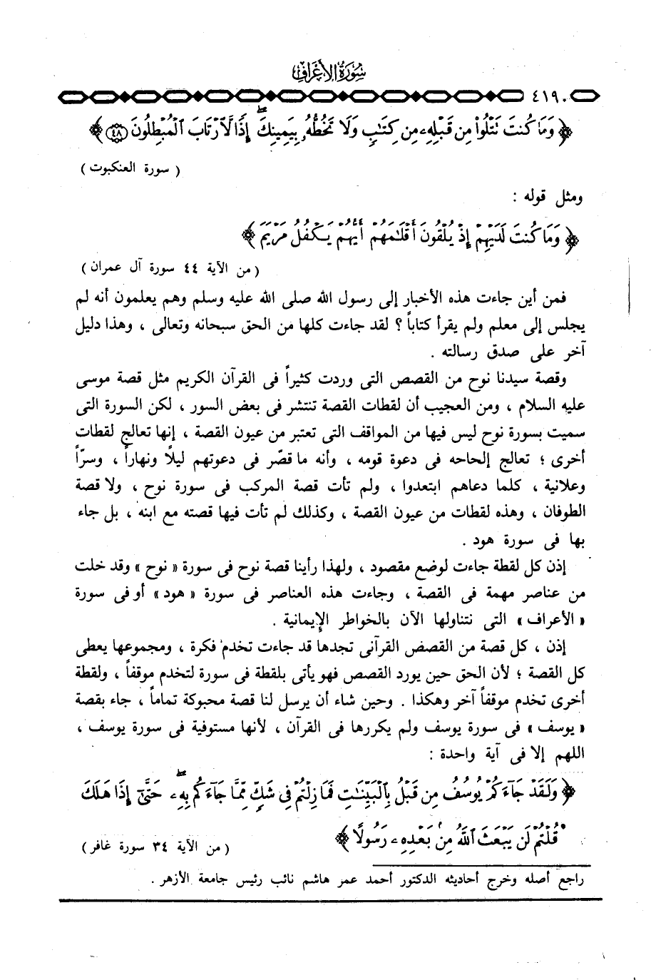 إذن، كل قصة من القصص القرآني تجدها قد جاءت تخدم فكرة، ومجموعها يعطي كل القصة؛ لأن الحق حين يورد القصص فهو يأتي بلقطة في سورة لتخدم موقفاً، ولقطة أخرى تخدم موقفاً آخر وهكذا. وحين شاء أن يرسل لنا قصة محبوكة تماماً، جاء بقصة «يوسف» في سورة يوسف ولم يكررها في القرآن، لأنها مستوفية في سورة يوسف، اللهم إلا في آية واحدة: {وَلَقَدْ جَآءَكُمْ يُوسُفُ مِن قَبْلُ بالبينات فَمَا زِلْتُمْ فِي شَكٍّ مِّمَّا جَآءَكُمْ بِهِ حتى إِذَا هَلَكَ قُلْتُمْ لَن يَبْعَثَ الله مِن بَعْدِهِ رَسُولاً ... } [غافر: 34]