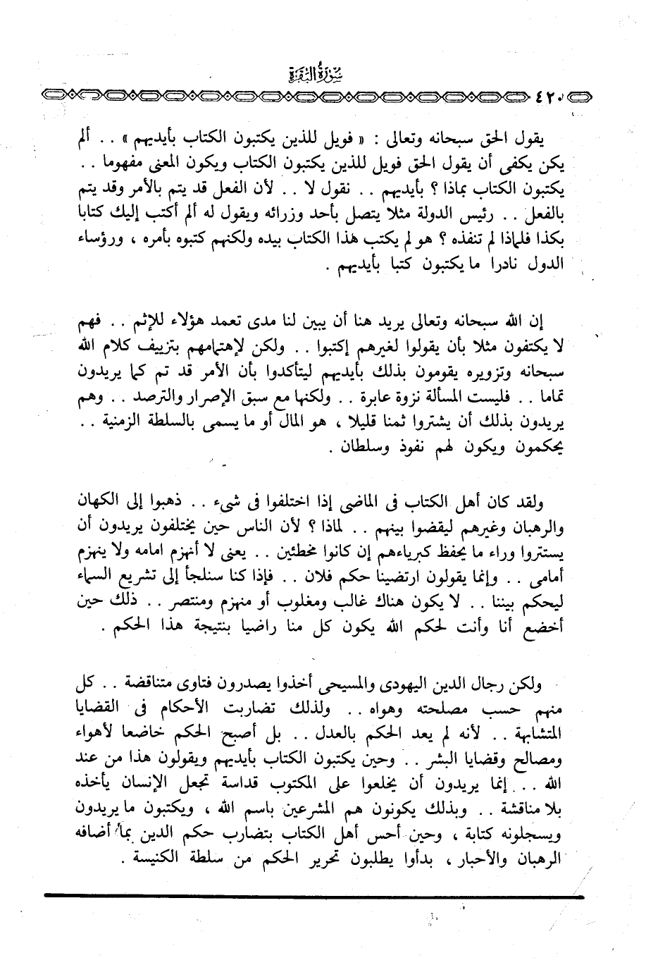. كل منهم حسب مصلحته وهواه. . ولذلك تضاربت الأحكام في القضايا المتشابهة. . لأنه لم يعد الحكم بالعدل. . بل أصبح الحكم خاضعا لأهواء ومصالح وقضايا البشر. . وحين يكتبون الكتاب بأيديهم ويقولون هذا من عند الله. . إنما يريدون أن يخلعوا على المكتوب قداسة تجعل الإنسان يأخذه بلا مناقشة. . وبذلك يكونون هم المشرعين باسم الله، ويكتبون ما يريدون ويسجلونه كتابه، وحين أحس أهل الكتاب بتضارب حكم الدين بما أضافه الرهبان والأحبار، بدأوا يطلبون تحرير الحكم من سلطة الكنيسة.