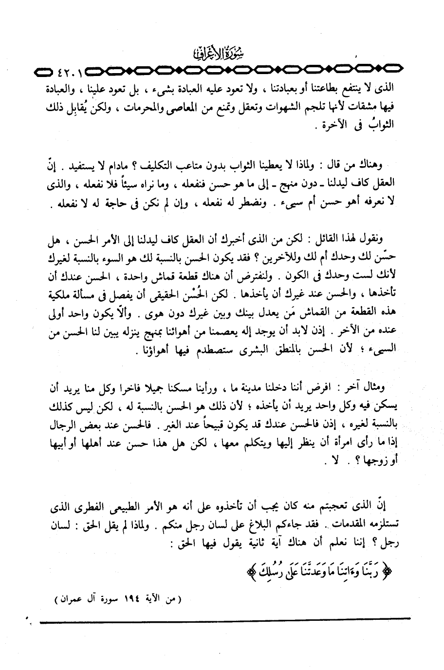 ونقول لها القائل: لكن من الذي أخبرك أن العقل كاف ليدلنا إلى الأمر الحسن، هل حسّن لك وحدك أم لك وللآخرين؟ فقد يكون الحسن بالنسبة لك هو السوء بالنسبة لغيرك لأنك لست وحدك في الكون. ولنفترض أن هناك قطعة قماش واحدة، الحسن عندك أن تأخذها، والحسن عند غيرك أن يأخذها. لكن الحُسْن الحقيقي أن يفصل في مسألة ملكية هذه القطعة من القماش مَن يعدل بينك وبين غيرك دون هوى. وألاّ يكون واحد أولى عنده من الآخر. إذن لابد أن يوجد إله يعصمنا من أهوائنا بمنهج ينزله يبين لنا الحسن من السيء؛ لأن الحسن بالمنطق البشري ستصدم فيها أهواؤنا.