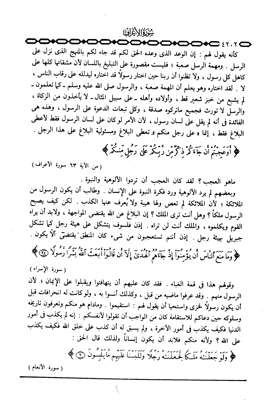 وبعضهم لم يرد الألوهية ورد فكرة النبوة على الإِنسان. وطالب أن يكون الرسول من الملائكة؛ لأن الملائكة لم تعص ولها هيبة ولا يُعرف عنها الكذب لكن كيف يصبح الرسول ملكاً؟ وهل أنت ترى الملك؟ إن البلاغ عن الله يقتضي المواجهة، ولابد أن يراه القوم ويكلموه، والملك أنت لن تراه. إذن فلسوف يتشكل على هيئة رجل كما تشكل جبريل بهيئة رجل. إذن أنتم تستعجبون من شيء كان المنطق يقتضي ألاّ يكون. {وَمَا مَنَعَ الناس أَن يؤمنوا إِذْ جَآءَهُمُ الهدى إِلاَّ أَن قالوا أَبَعَثَ الله بَشَراً رَّسُولاً} [الإسراء: 94]