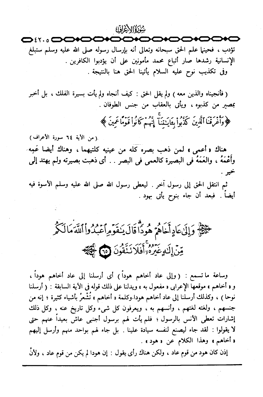وساعة ما تسمع: {وإلى عَادٍ أَخَاهُمْ هُوداً} أي أرسلنا إلى عاد أخاهم هوداً، و «أخاهم» موقعها الإِعرابي «مفعول به» ويدلنا على ذلك قوله في الآية السابقة: {أَرْسَلْنَا نُوحاً} ، وكذلك أرسلنا إلى عاد أخاهم هودا. وكلمة «أخاهم» تُشْعرُ بأشياء كثيرة؛ إنه من جنسهم، ولغته لغتهم، وأنسهم به، ويعرفون كل شيء وكل تاريخ عنه، وكل ذلك إشارات تعطى الأنس بالرسول؛ فلم يأت لهم برسول أجنبي عاش بعيداً عنهم حتى لا يقولوا: لقد جاء ليصنع لنفسه سيادة علينا بل جاء لهم بواحد منهم وأرسل إليهم «أخاهم» وهذا الكلام عن «هود» .