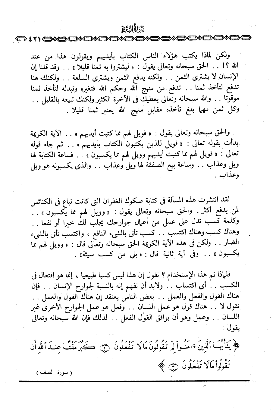 فلماذا تم هذا الإستخدام؟ نقول إن هذا ليس كسبا طبيعيا، إنما هو افتعال في الكسب. . أي اكتساب. . ولابد أن نفهم إنه بالنسبة لجوارح الإنسان. . فإن هناك القول والفعل والعمل. . بعض الناس يعتقد إن هناك القول والعمل. . نقول لا. . هناك قول هو عمل اللسان. . وفعل هو عمل الجوارح الأخرى غير اللسان. . وعمل وهو أن يوافق القول الفعل. . لذلك فإن الله سبحانه وتعالى يقول: {ياأيها الذين آمَنُواْ لِمَ تَقُولُونَ مَا لاَ تَفْعَلُونَ كَبُرَ مَقْتاً عِندَ الله أَن تَقُولُواْ مَا لاَ تَفْعَلُونَ} [الصف: 2 - 3]