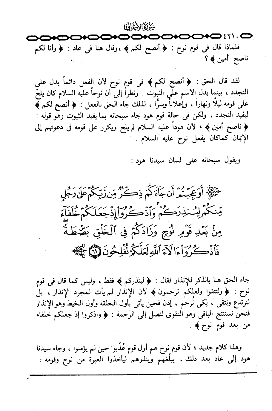 جاء الحق هنا بالذكر للإِنذار فقال: {لِيُنذِرَكُمْ} فقط، وليس كما قال في قوم نوح: {وَلِتَتَّقُواْ وَلَعَلَّكُمْ تُرْحَمُونَ} لأن الإِنذار لم يأت لمجرد الإِنذار، بل لنرتدع ونتقي، لِكي نُرحم، إذن فحين يأتي بأول الحلقة وأول الخيط وهو الإِنذار فنحن نستنتج الباقي وهو التقوى لنصل إلى الرحمة: {واذكروا إِذْ جَعَلَكُمْ خُلَفَآءَ مِن بَعْدِ قَوْمِ نُوحٍ} .