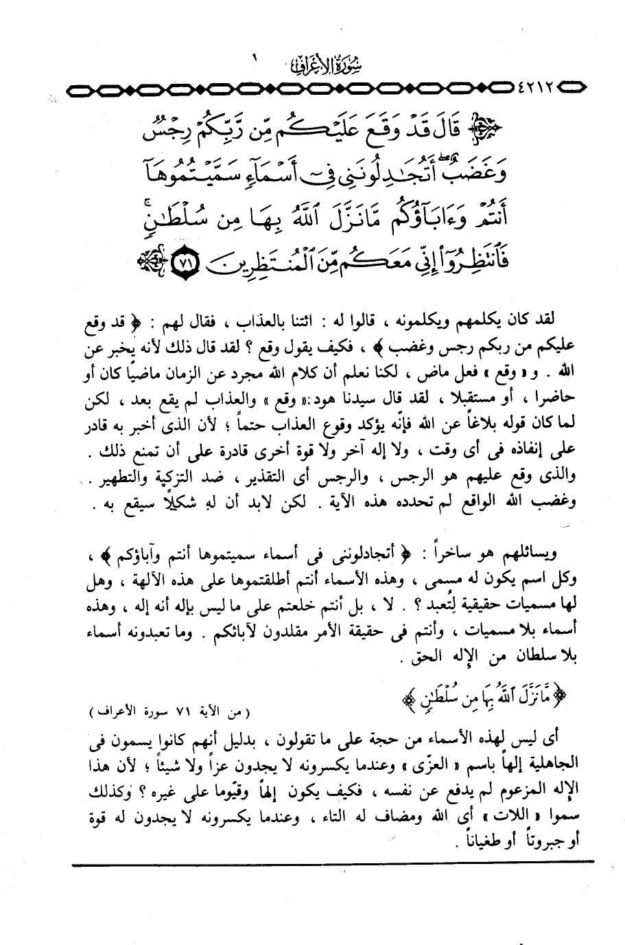 لقد كان يكلمهم ويكلمونه، قالوا له: ائتنا بالعذاب، فقال لهم: {قَدْ وَقَعَ عَلَيْكُمْ مِّن رَّبِّكُمْ رِجْسٌ وَغَضَبٌ} ، فكيف يقول وقع؟ لقد قال ذلك لأنه يخبر عن الله. و «وقع» فعل ماض، لكنا نعلم أن كلام الله مجرد عن الزمان ماضياً كان أو حاضرا، أو مستقبلا، لقد قال سيدنا هود: «وقع» والعذاب لم يقع بعد، لكن لما كان قوله بلاغاً عن الله فإنّه يؤكد وقوع العذاب حتماً؛ لأن الذي أخبر به قادر لما كان قوله بلاغاً عن الله فإنّه يؤكد وقوع العذاب حتماً؛ لأن الذي أخبر به قادر على إنقاذه في أي وقت، ولا إله آخر ولا قوة أخرى قادرة على أن تمنع ذلك. والذي وقع عليهم هو الرجس، والرجس أي التقذير، ضد التزكية والتطهير. وغضب الله الواقع لم تحدده هذه الآية. لكن لا بد أن له شكلاً سيقع به.